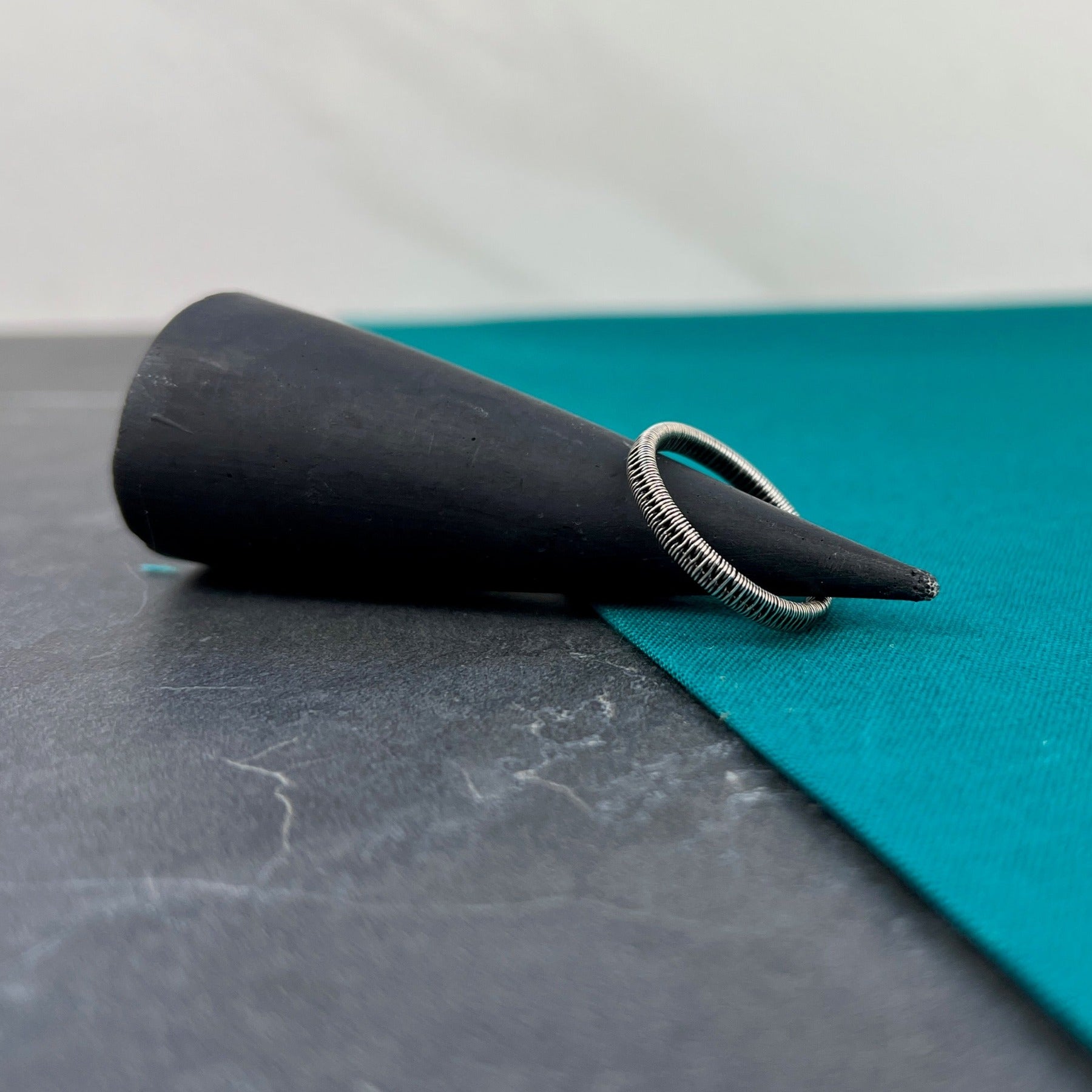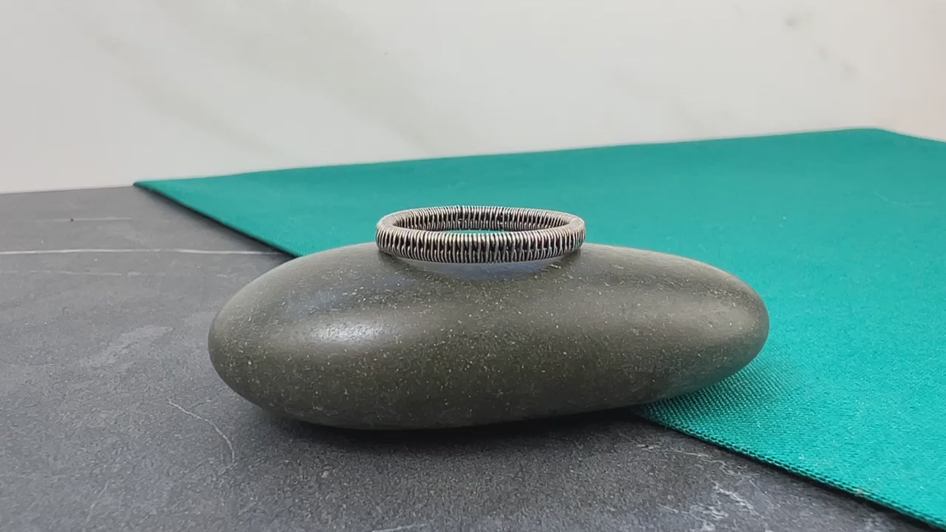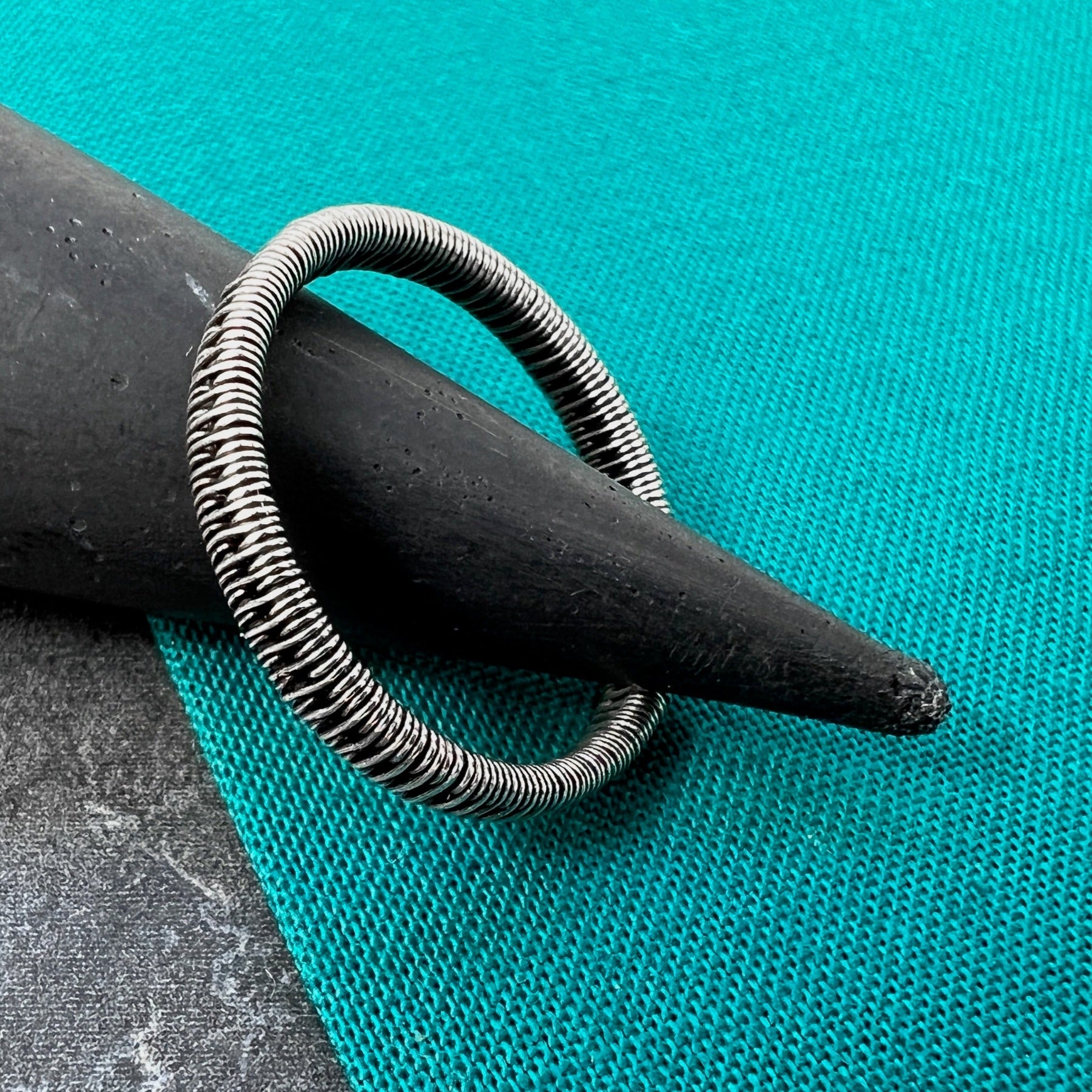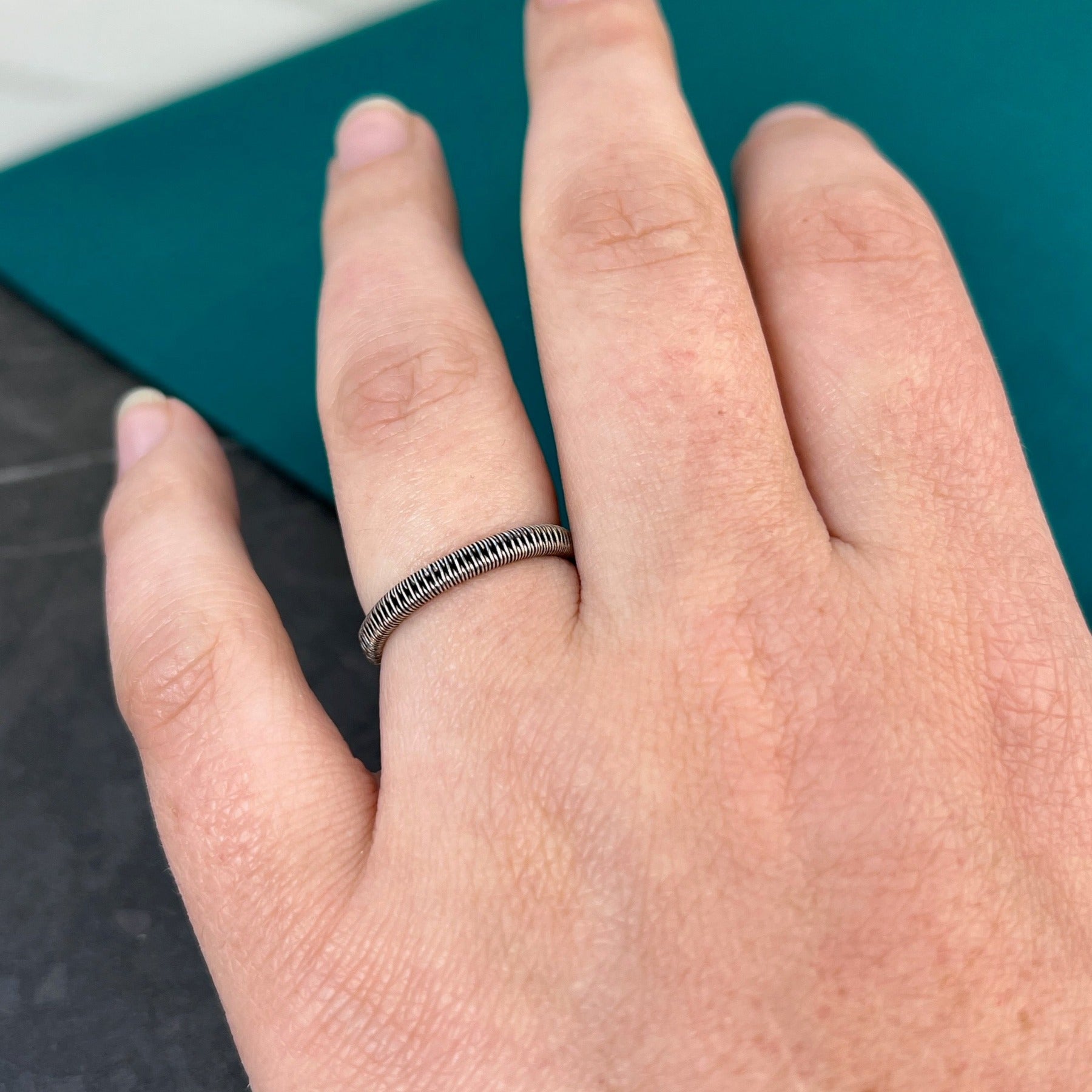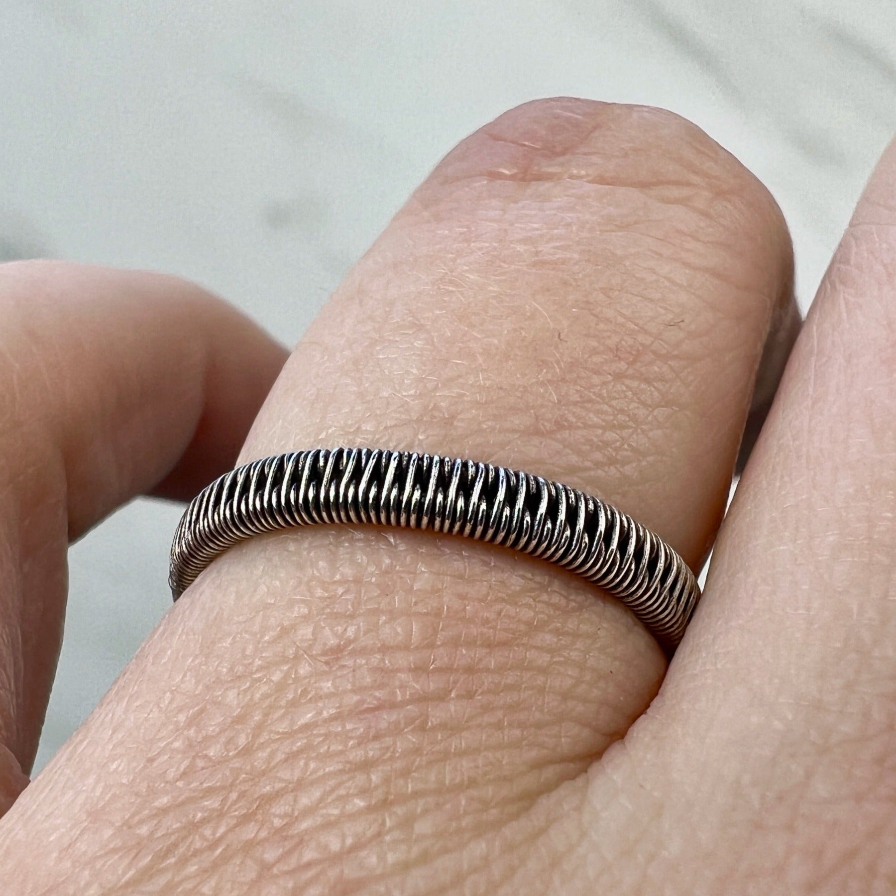 Introducing our exquisite Wirewoven Essentials Ring, a must-have addition to your jewelry collection. This dainty ring band, measuring a mere 3mm wide, boasts an intricate woven design that encircles the entire band seamlessly. The oxidized finish adds a touch of depth, highlighting the meticulous craftsmanship of the weave.