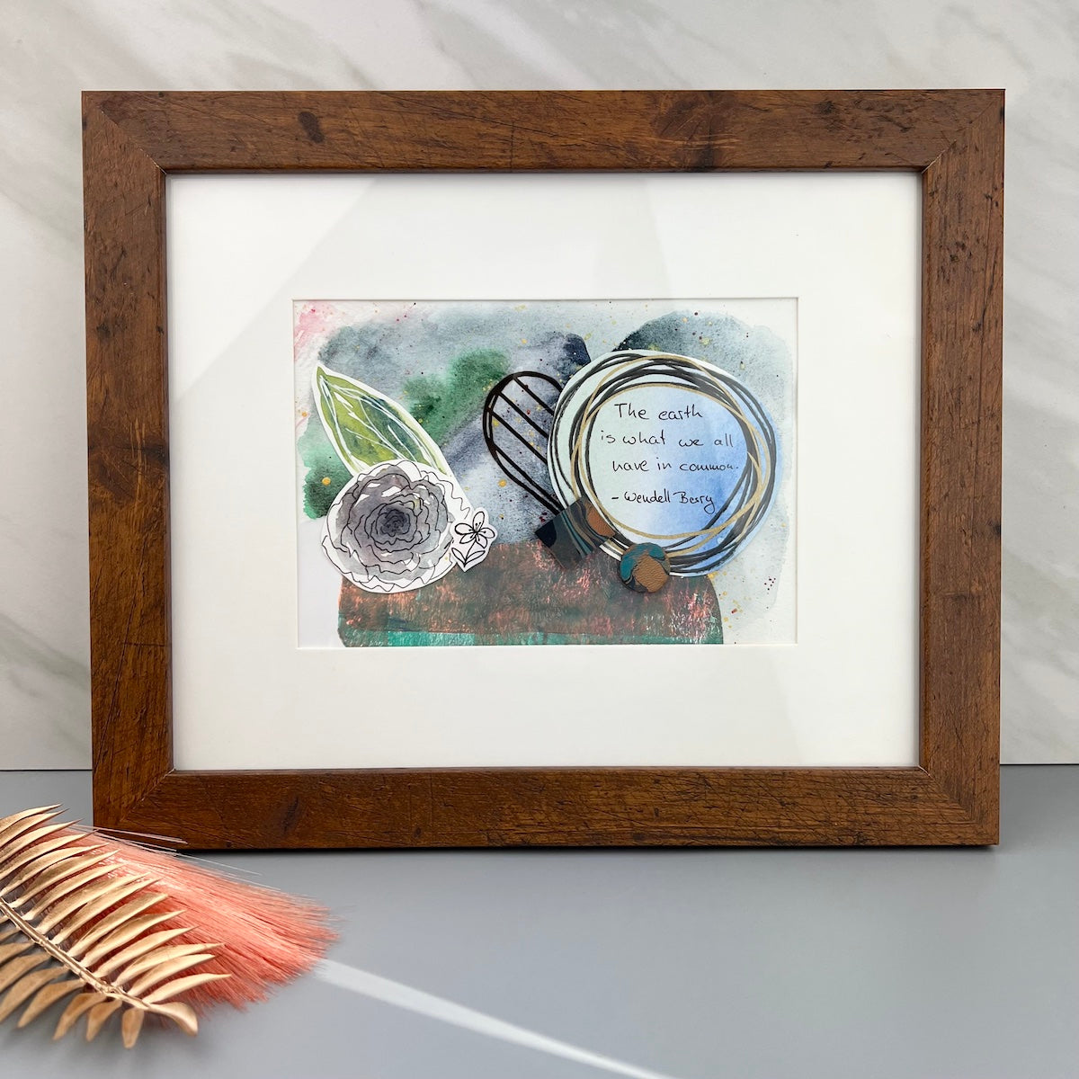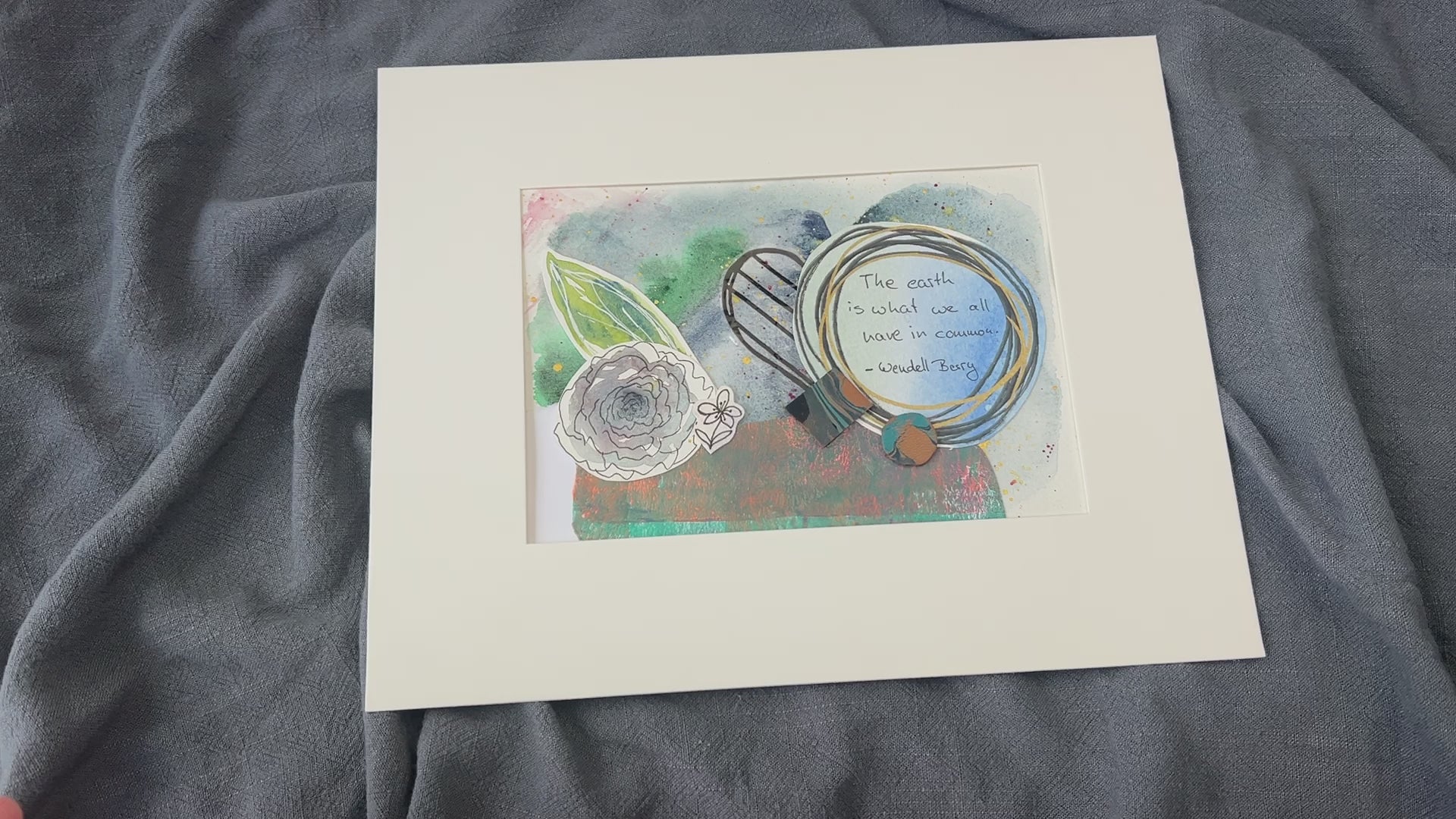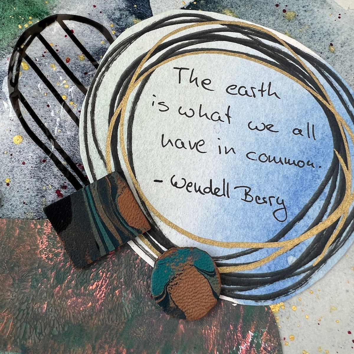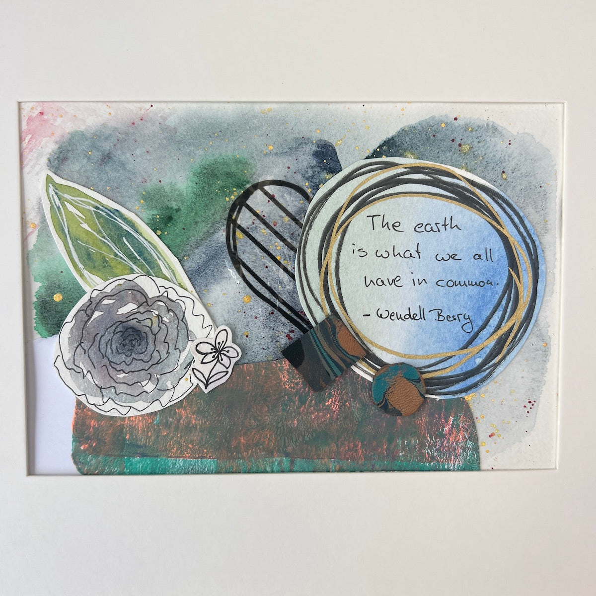 In the spirit of Earth Day, this collage is made from scraps and reused materials. Wendell Berry's quote "The earth is what we all have in common." is featured as the main focal point on this collage. The background of the collage features an original watercolor wash in blues and greens with gold accents. Various materials were used to put this collage together: plastic from an old bag, leather scraps that were marbled with blues, and hand painted watercolor art works.