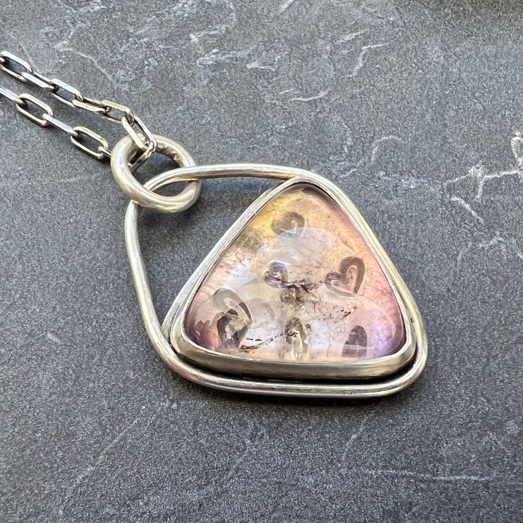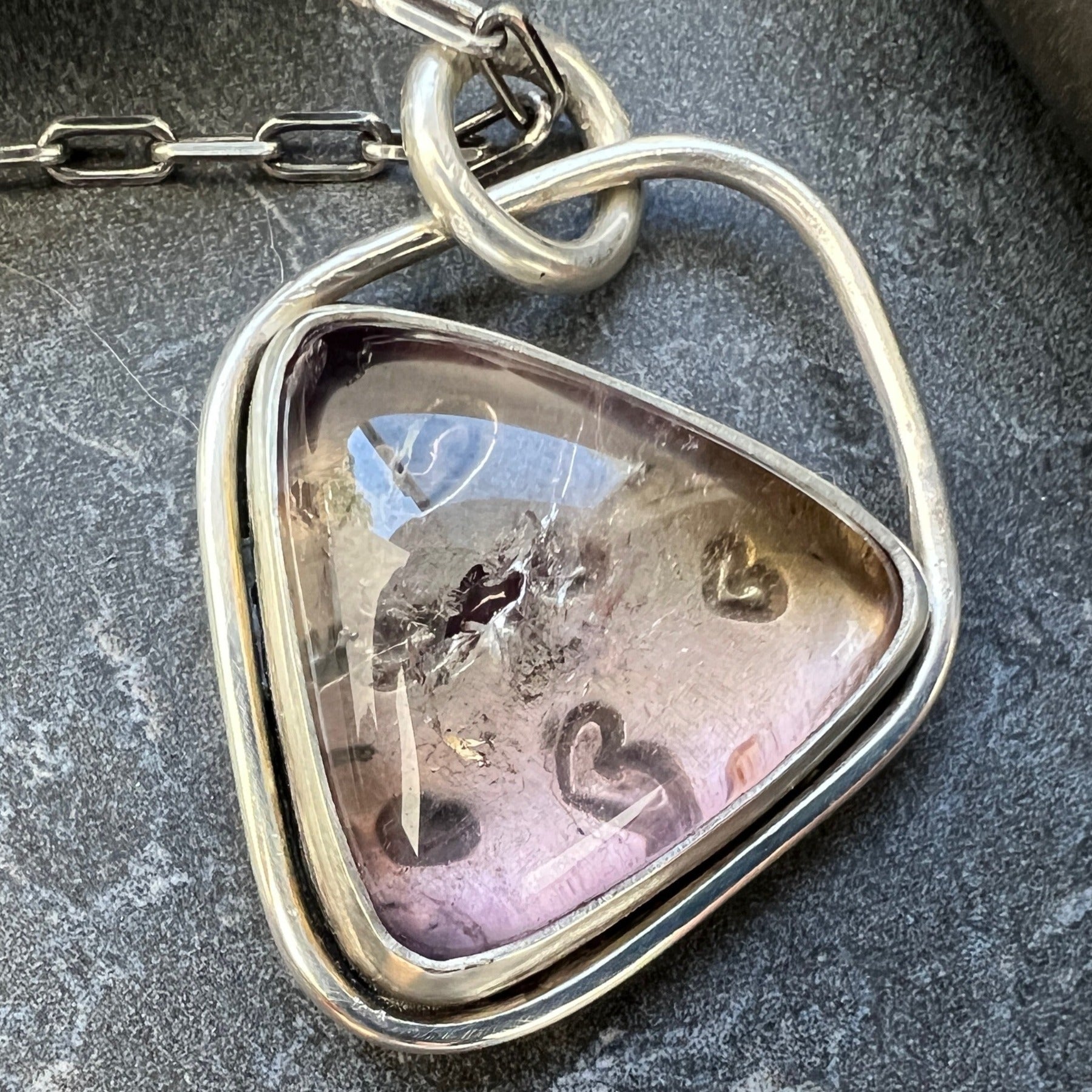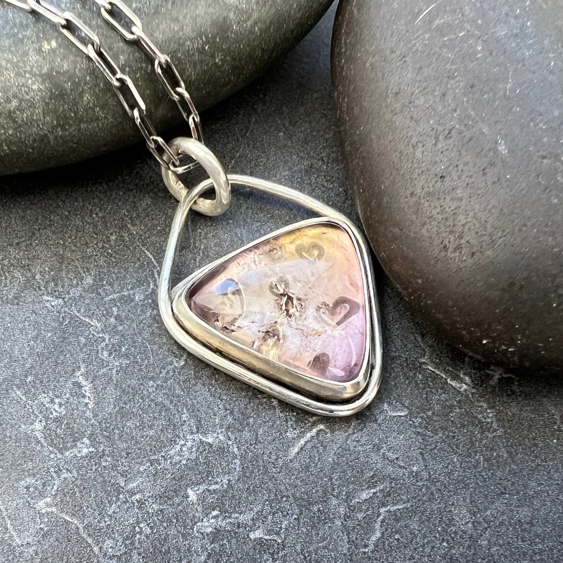 ✔ This pendant is cute and unique! An absolutely stunning silver bezel setting carefully hugs this yellow and purple ametrine stone. The overall design resembles a heart shape however is not an actual heart - this pendant can be worn for any occasion. The background was stamped with hearts which shine through the stone for added detail. The stone itself has some natural inclusions and at some angles displays a rainbow shimmer.