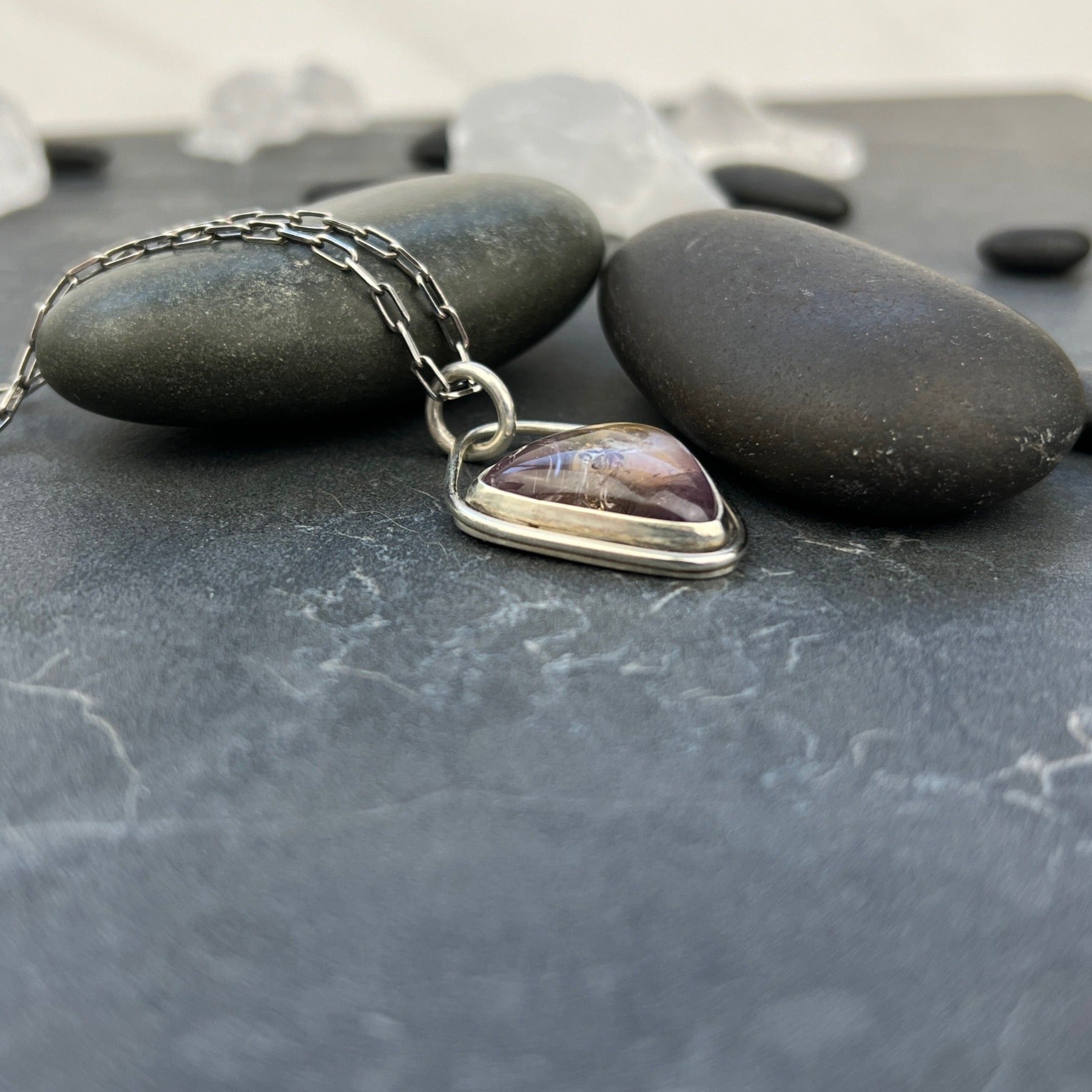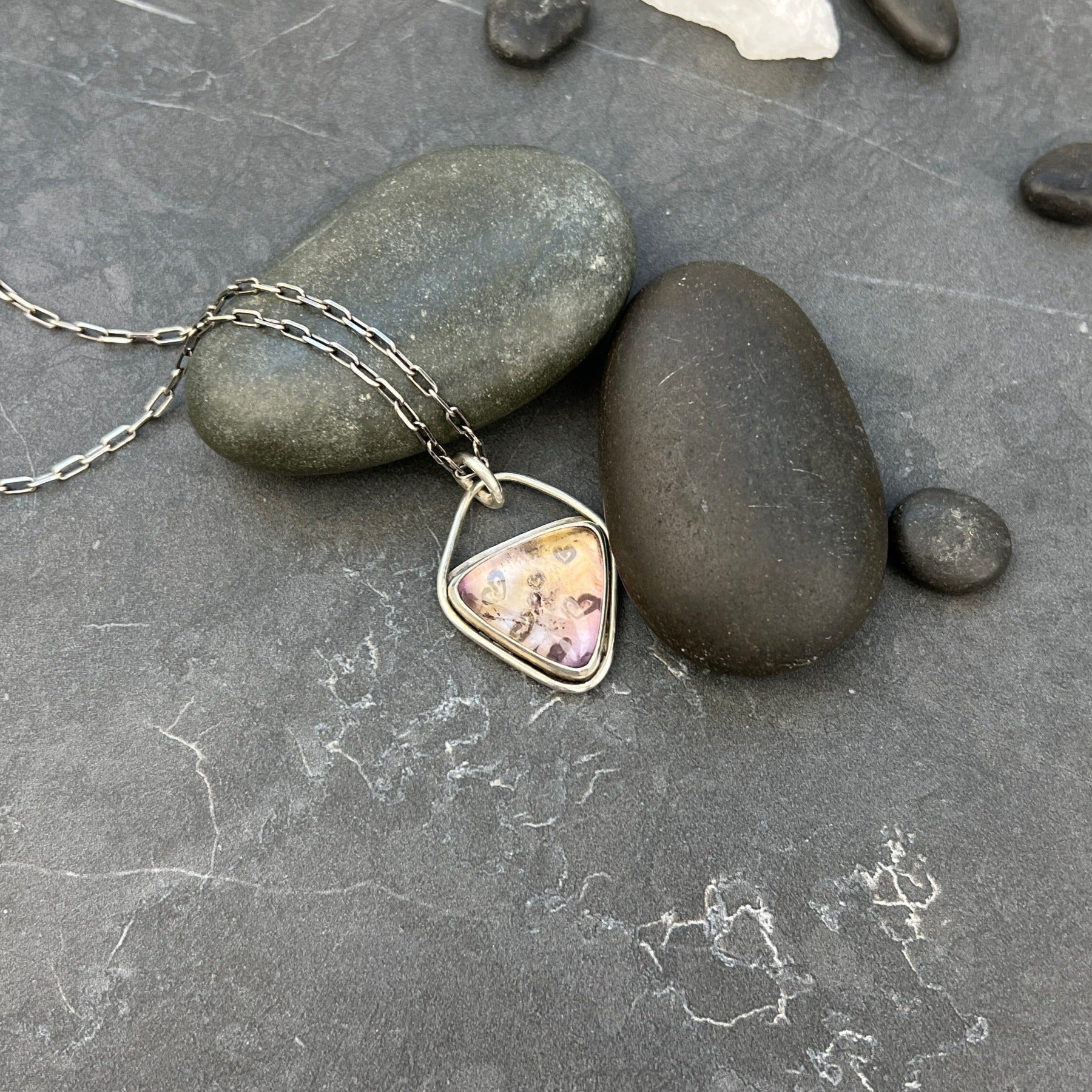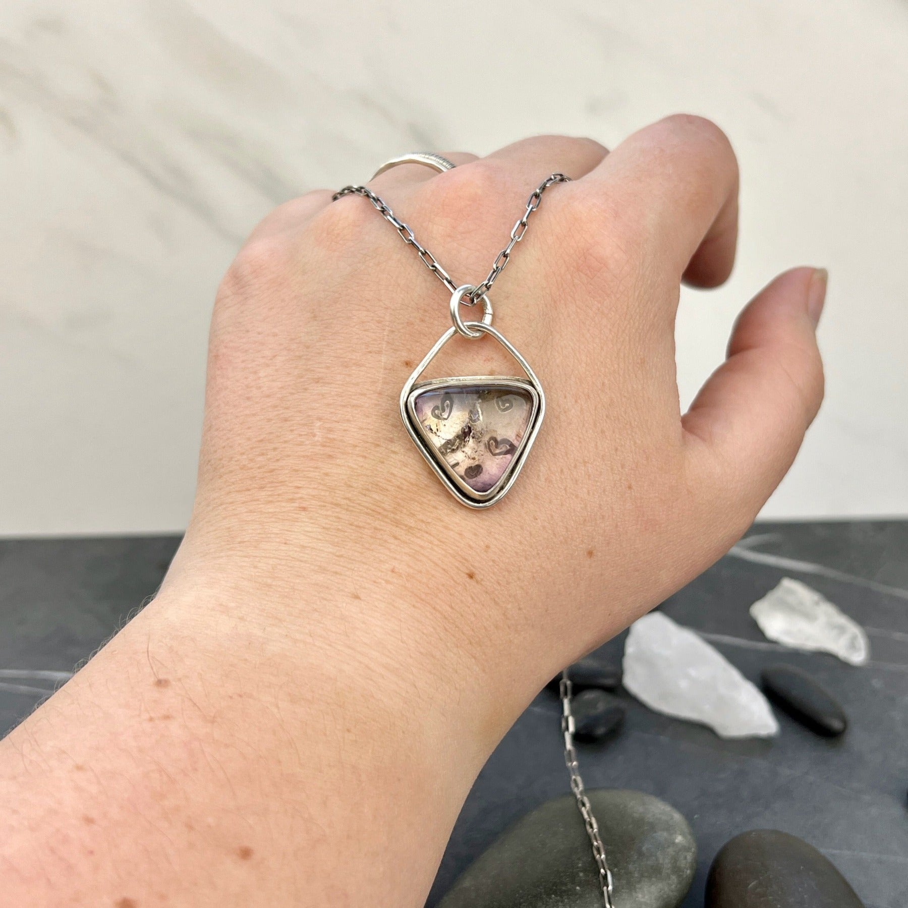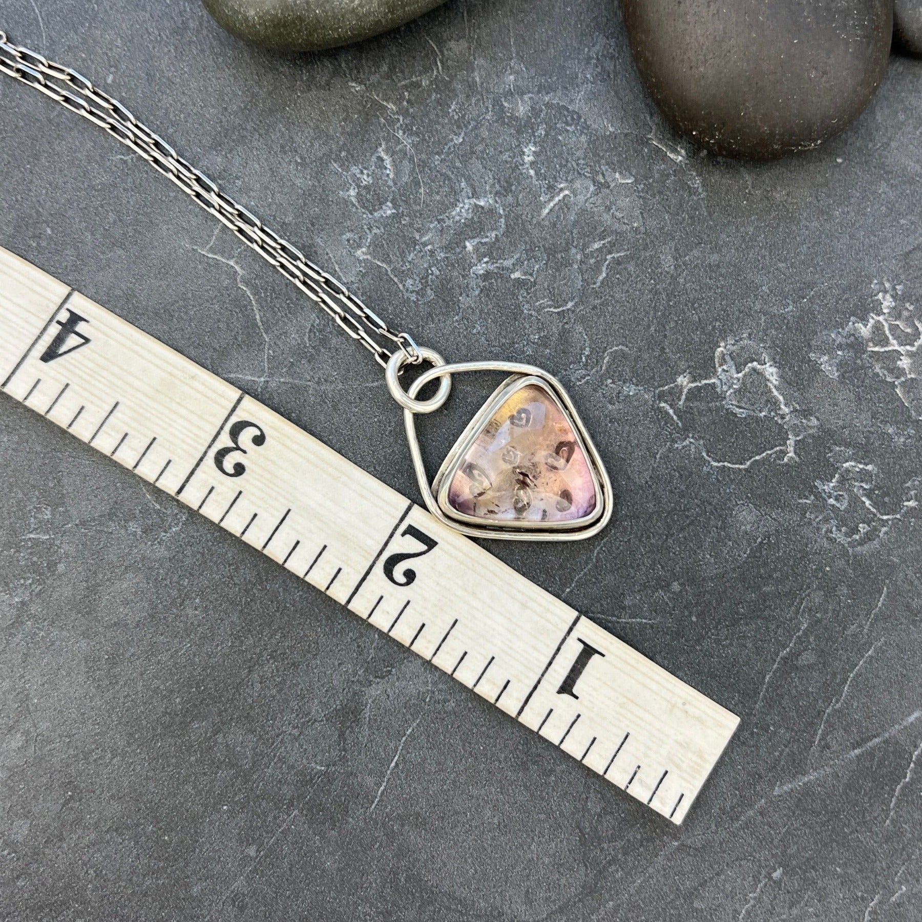 ✔ This pendant is cute and unique! An absolutely stunning silver bezel setting carefully hugs this yellow and purple ametrine stone. The overall design resembles a heart shape however is not an actual heart - this pendant can be worn for any occasion. The background was stamped with hearts which shine through the stone for added detail. The stone itself has some natural inclusions and at some angles displays a rainbow shimmer.