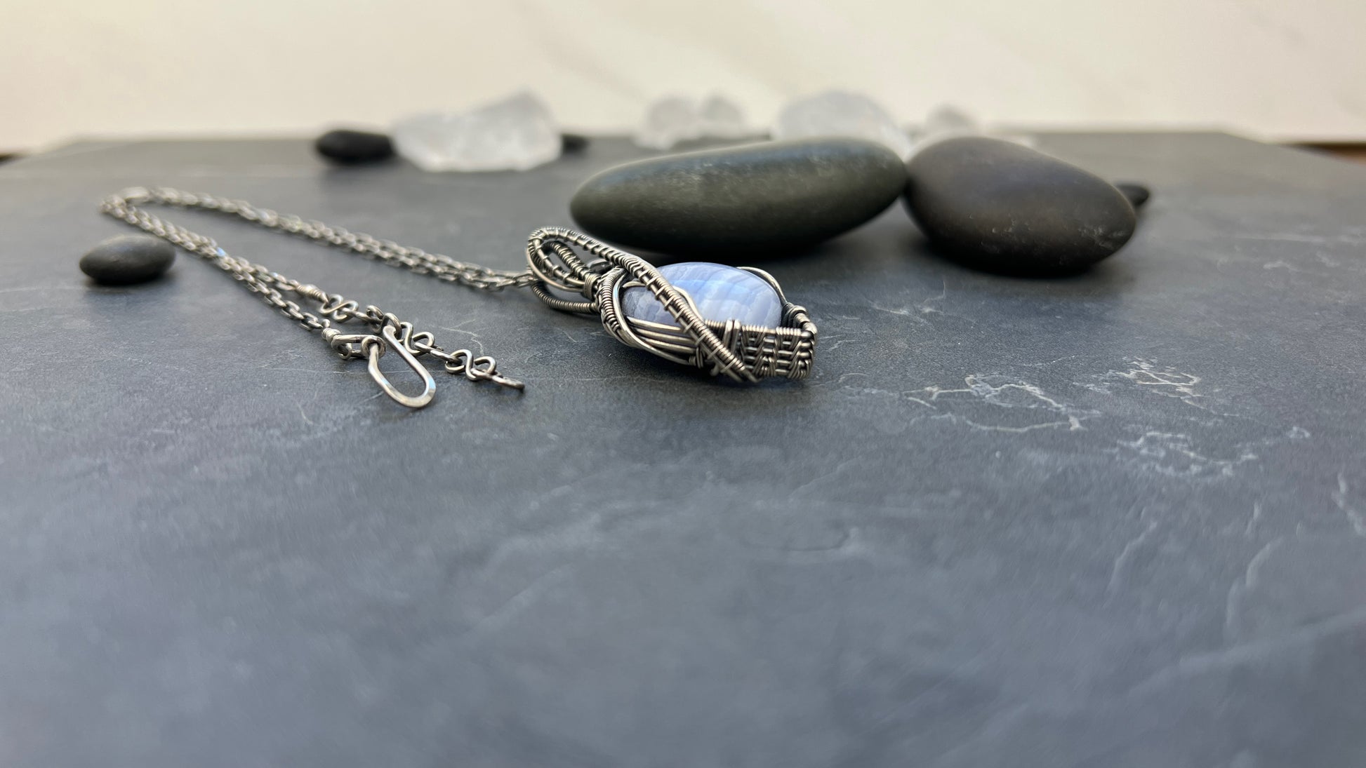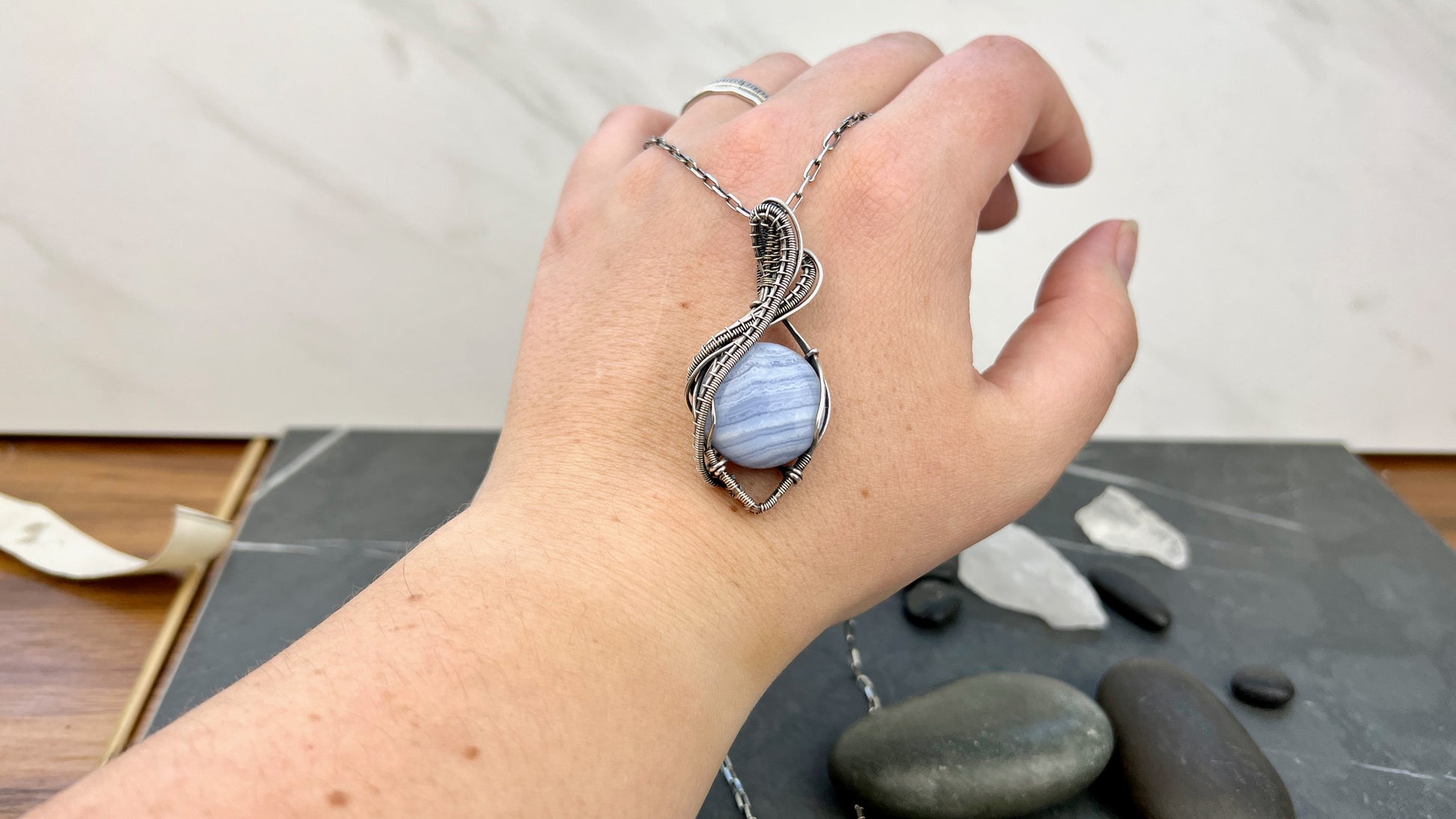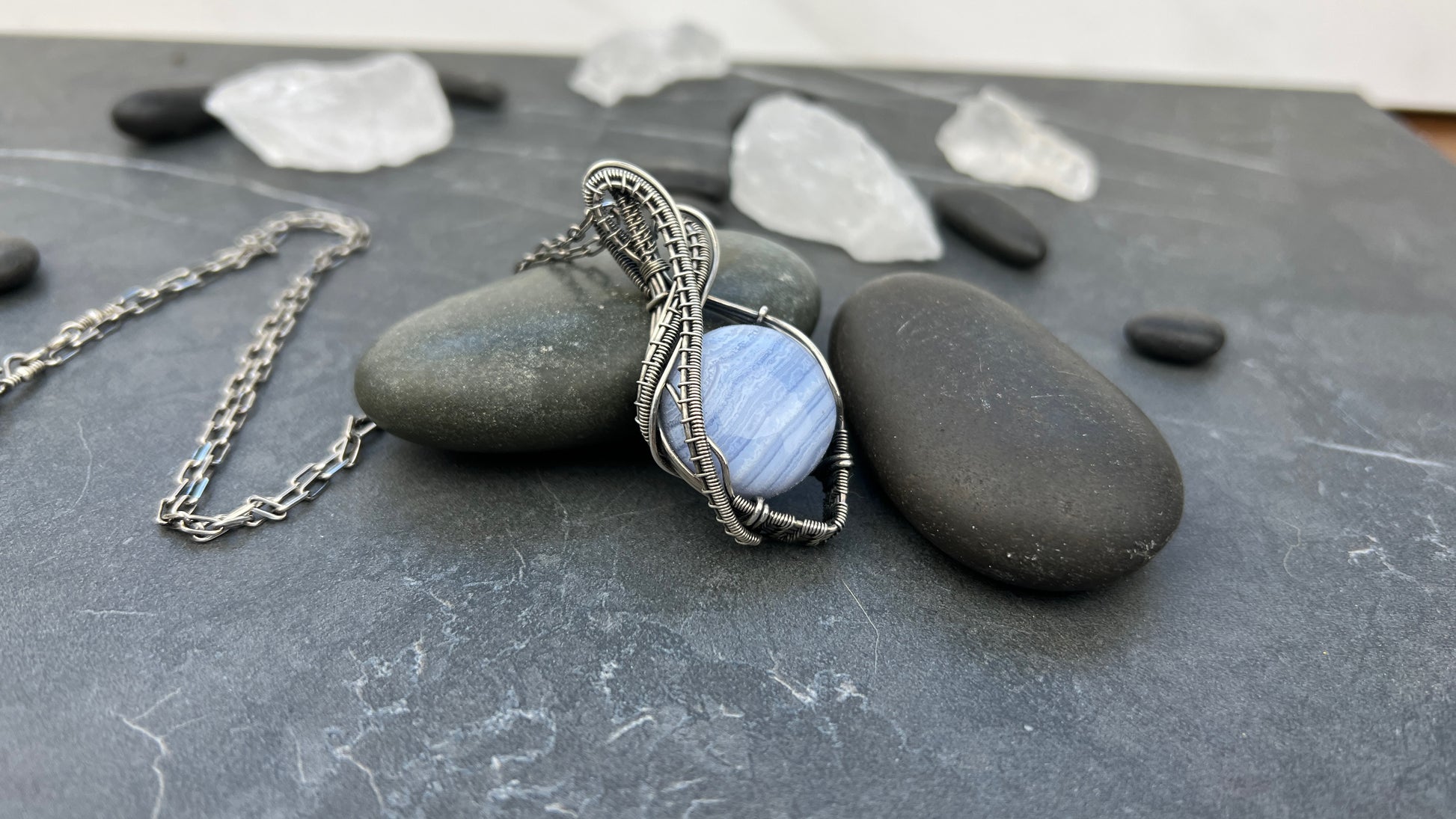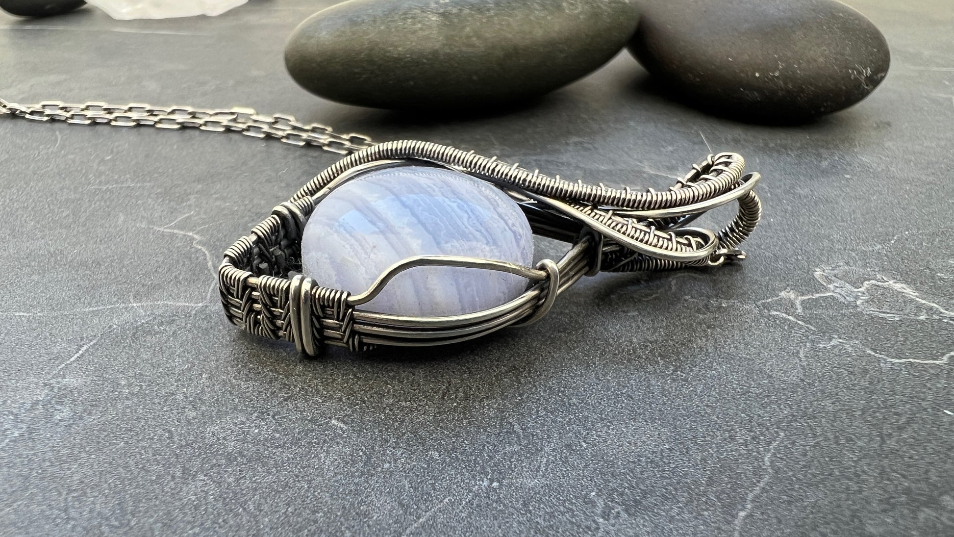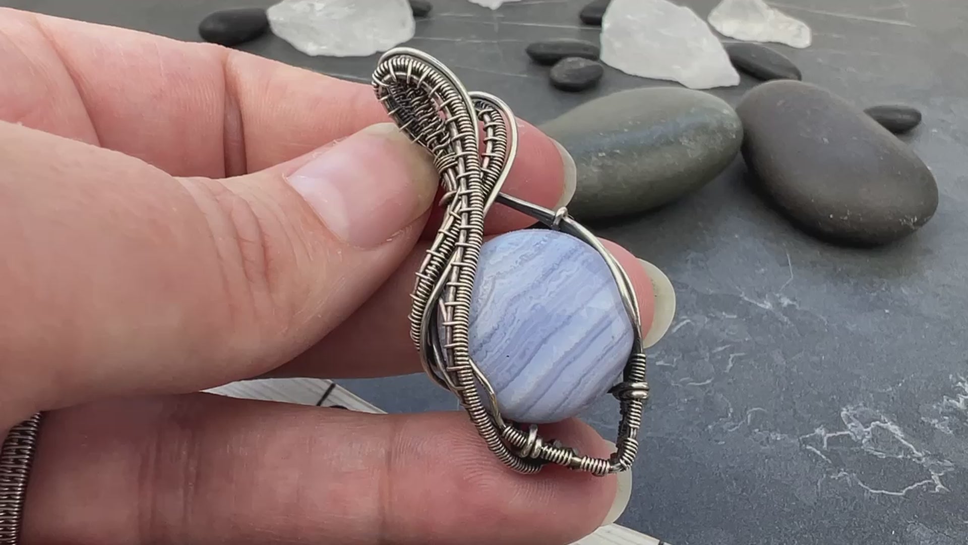 ✔ This pendant is made from .925 sterling silver wire encompassing a round blue lace agate. The silver wire has been antiqued (oxidized) and polished to a shine.