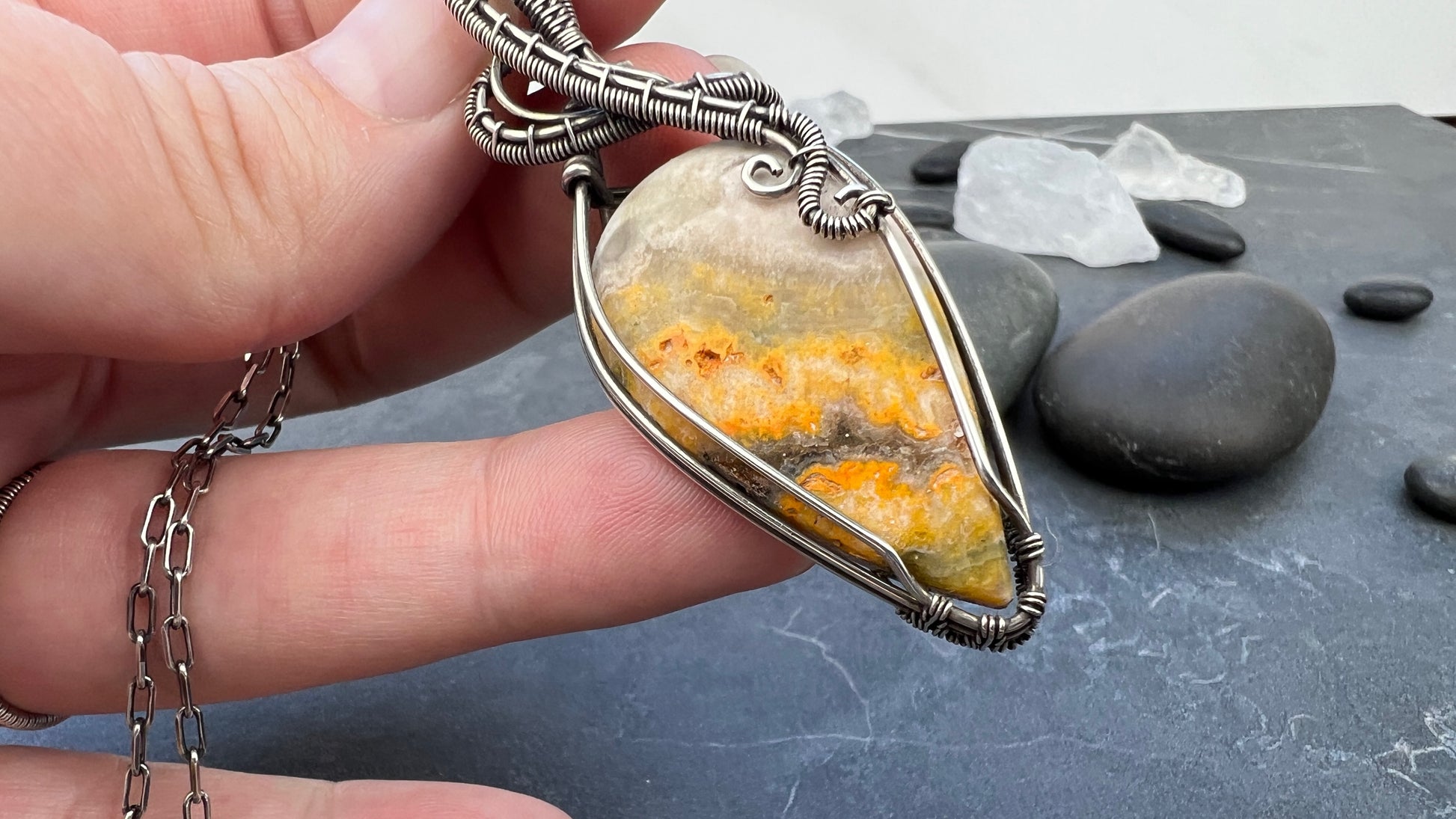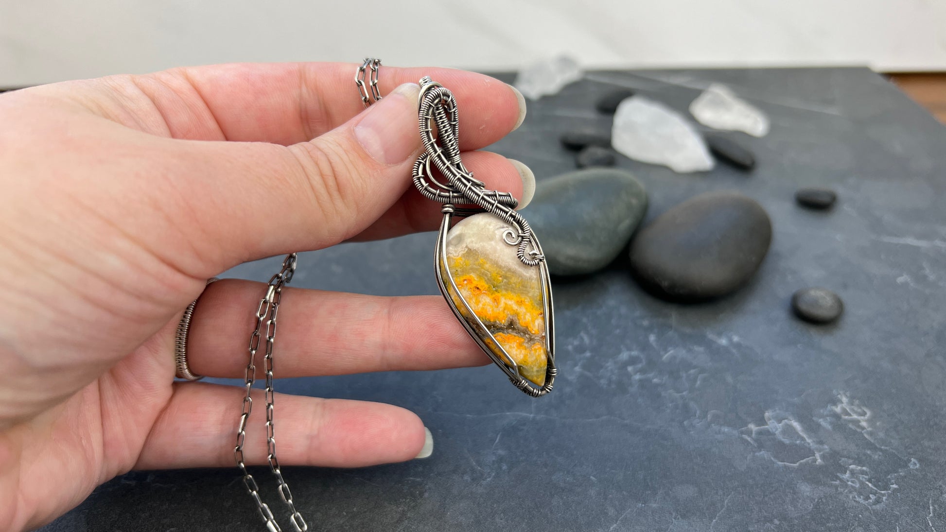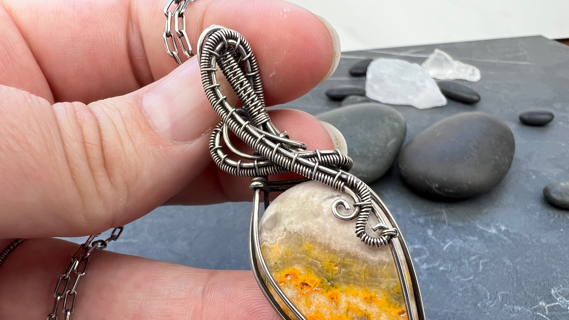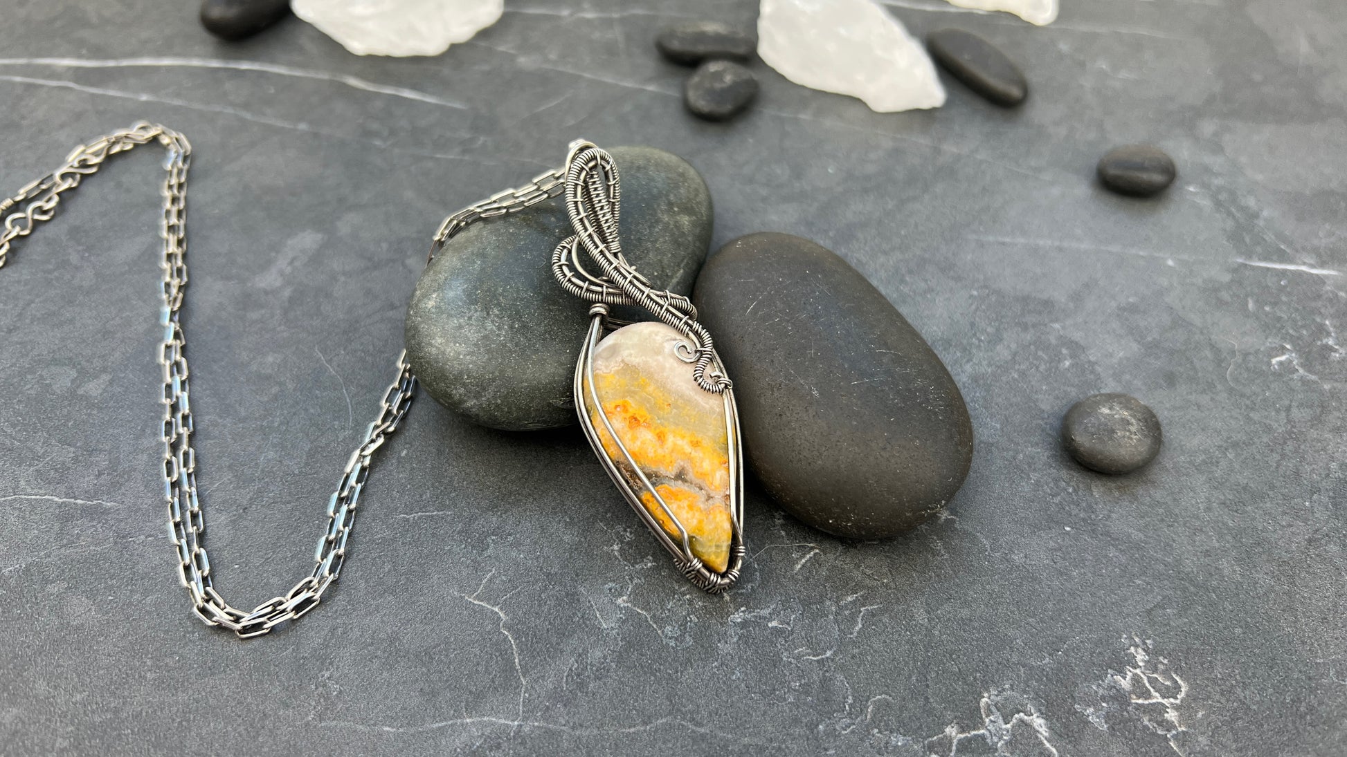 ✔ The artistic wirework in this pendant gracefully flows around the natural beauty of the bumblebee Jasper. The stone is exceptionally unique displaying a gorgeous array of yellows, oranges, browns, and white. This pendant is a wonderful addition to any spring or summer outfit and will make a wonderful gift (maybe for yourself?!).