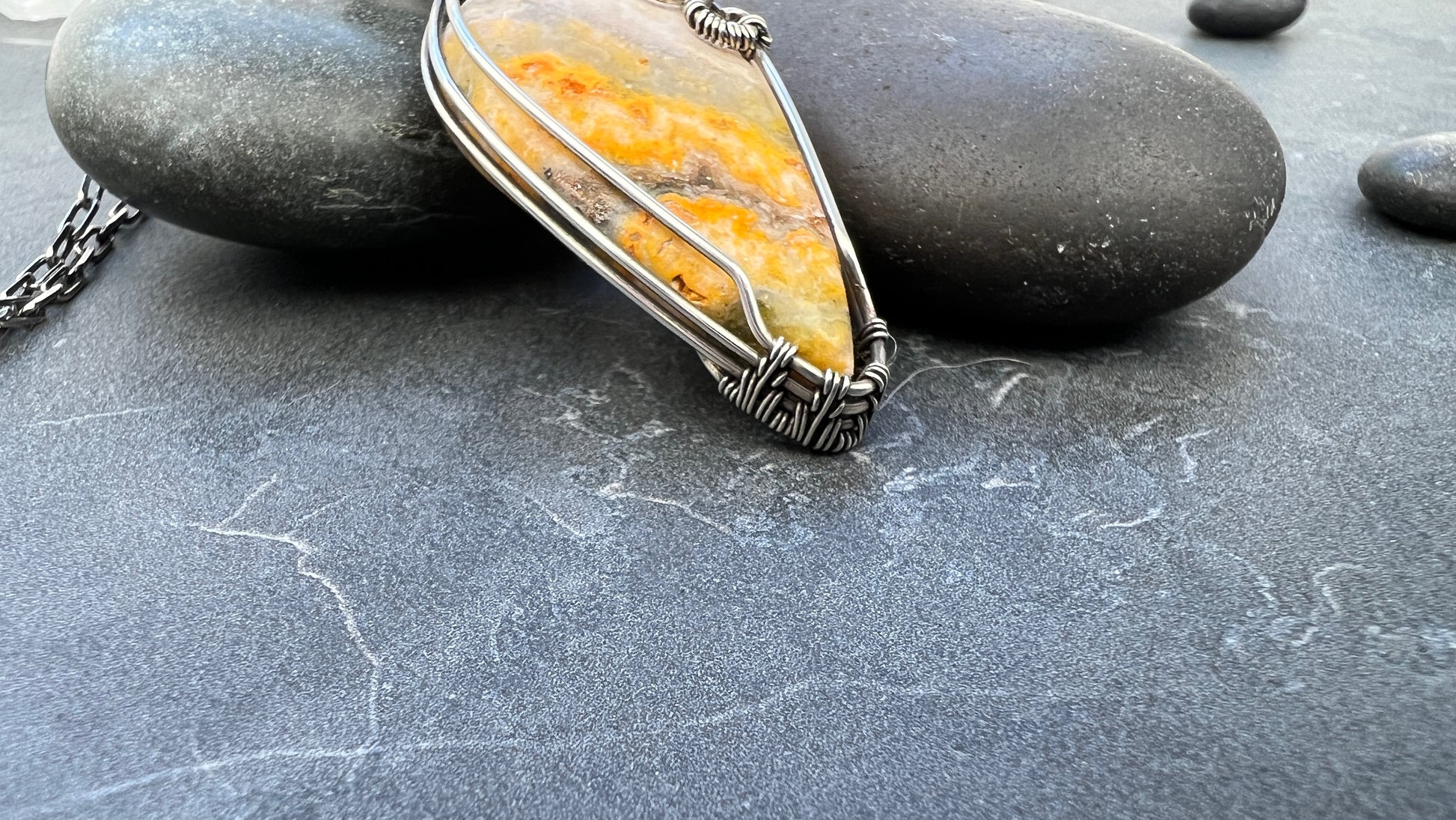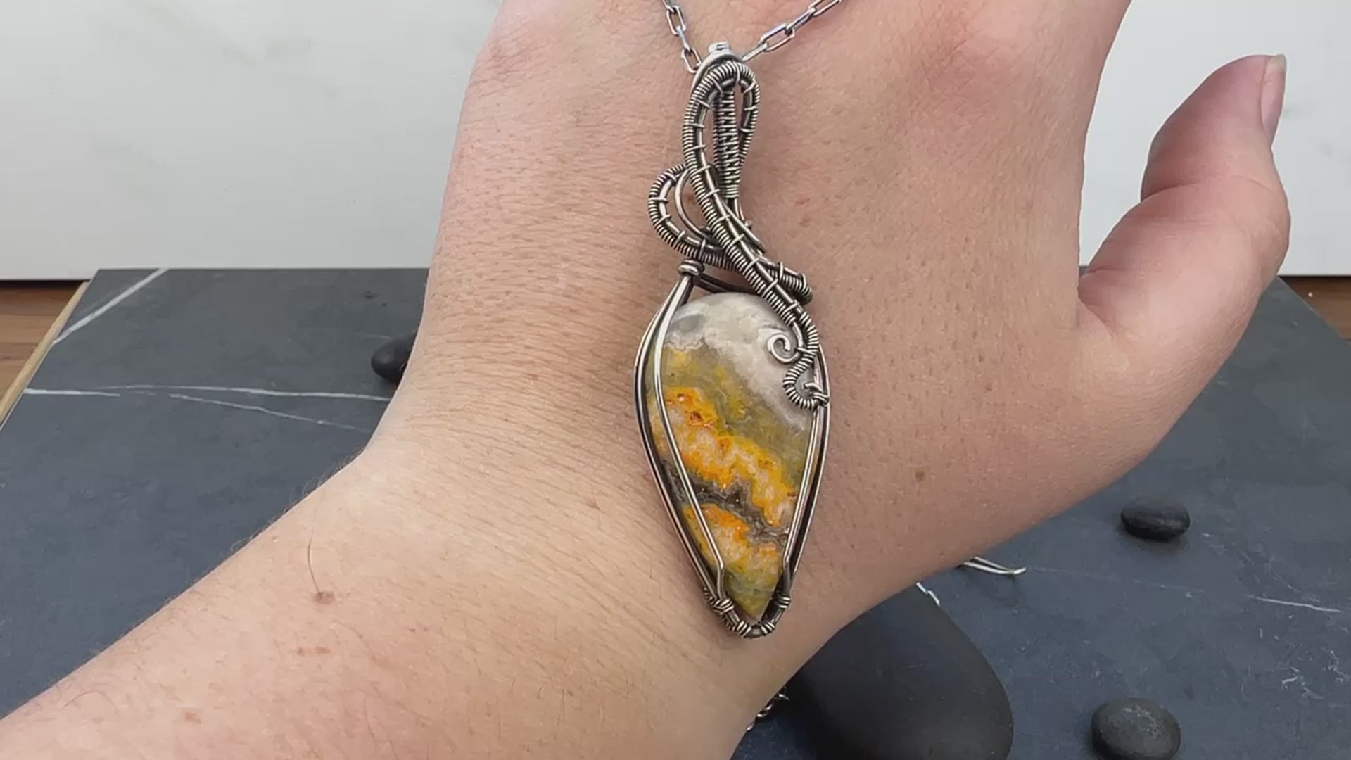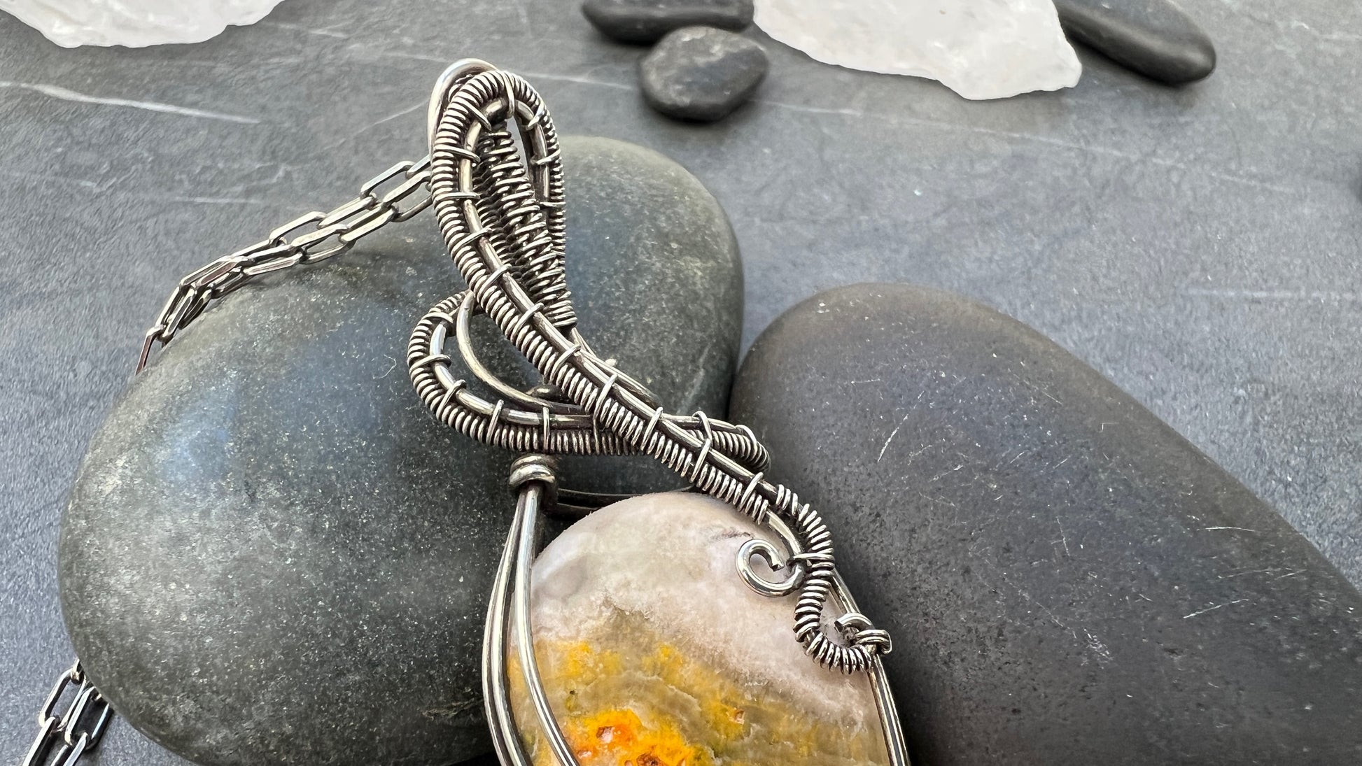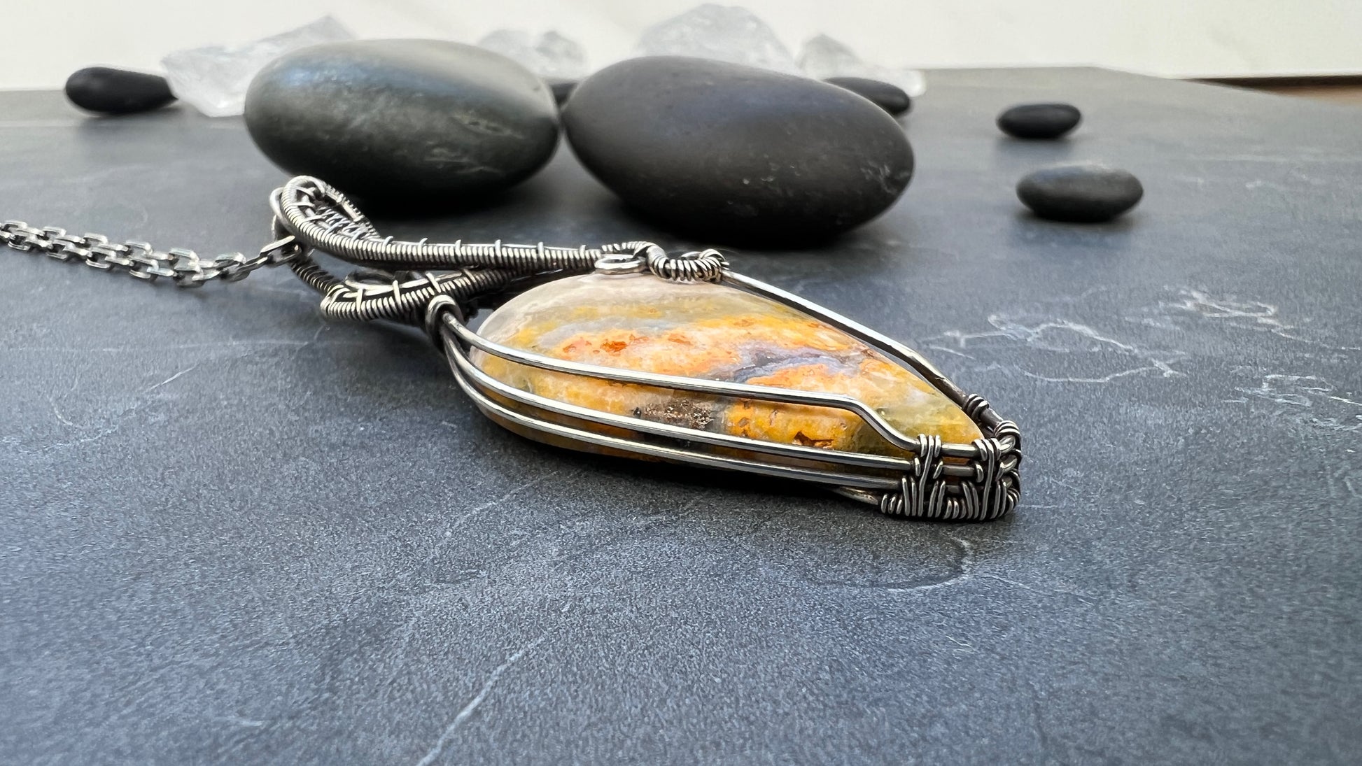 ✔ The artistic wirework in this pendant gracefully flows around the natural beauty of the bumblebee Jasper. The stone is exceptionally unique displaying a gorgeous array of yellows, oranges, browns, and white. This pendant is a wonderful addition to any spring or summer outfit and will make a wonderful gift (maybe for yourself?!).