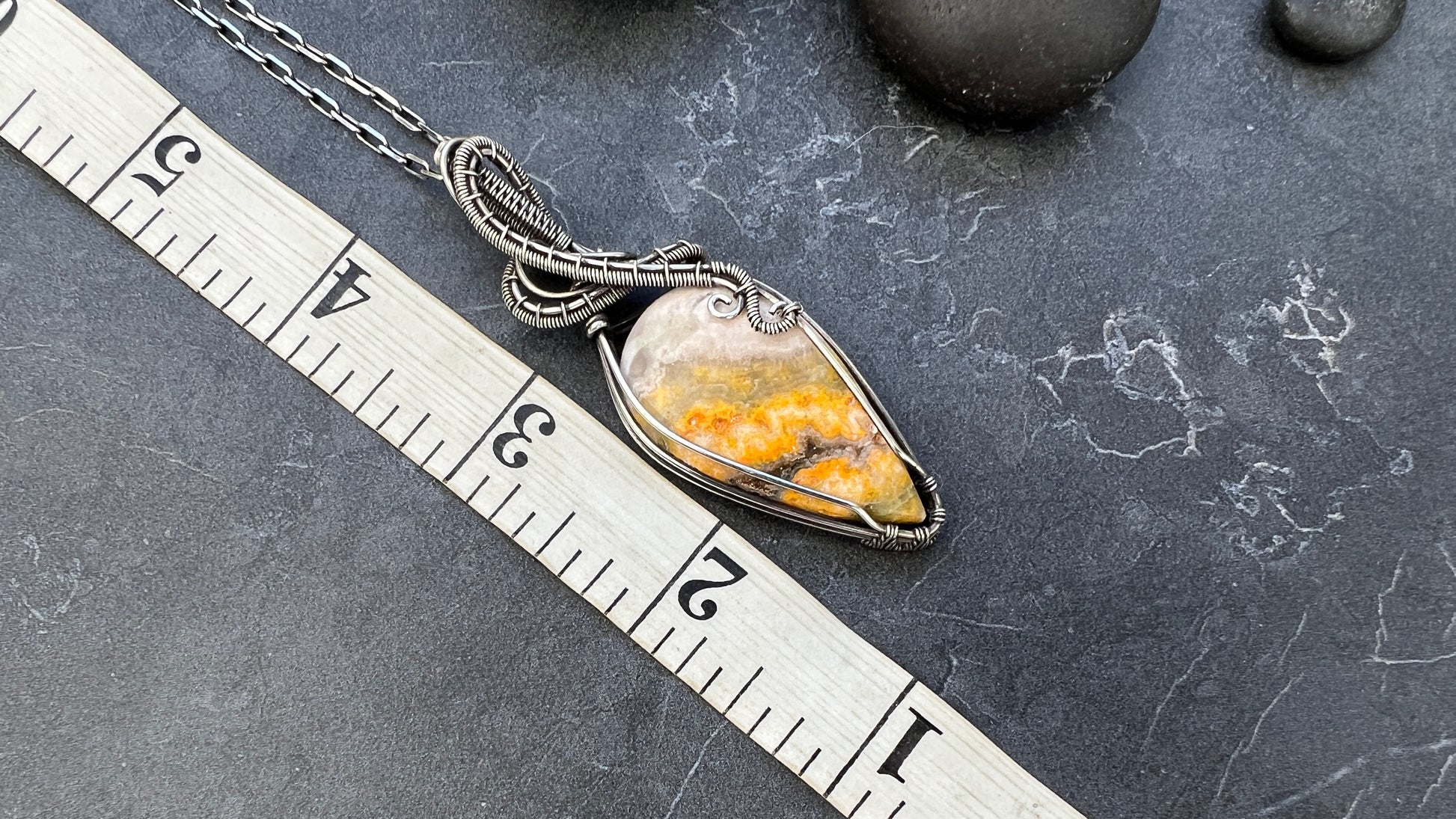 ✔ This pendant is made from .925 sterling silver wire and bumblebee jasper. The silver wire has been antiqued (oxidized) and polished to a shine.