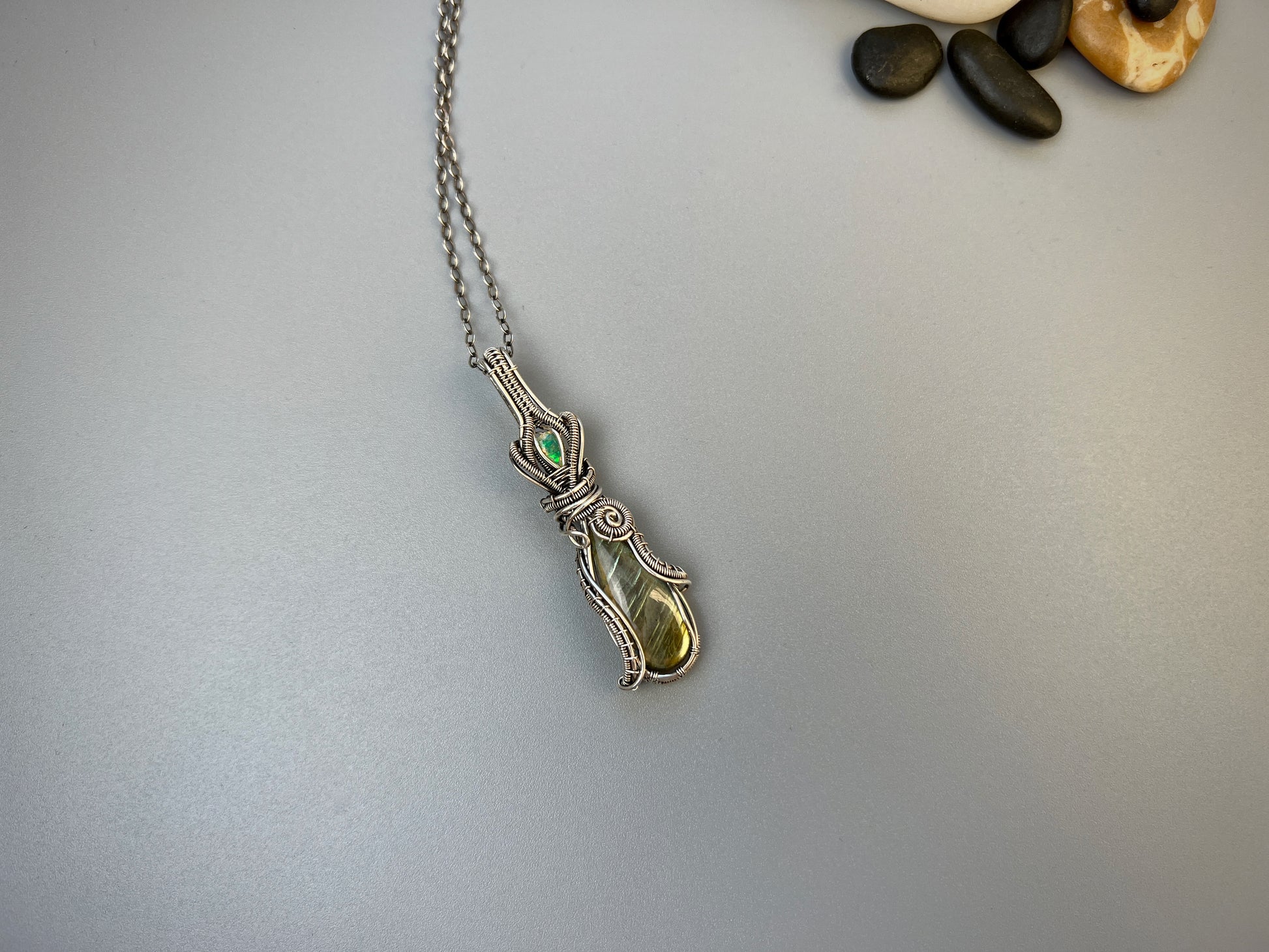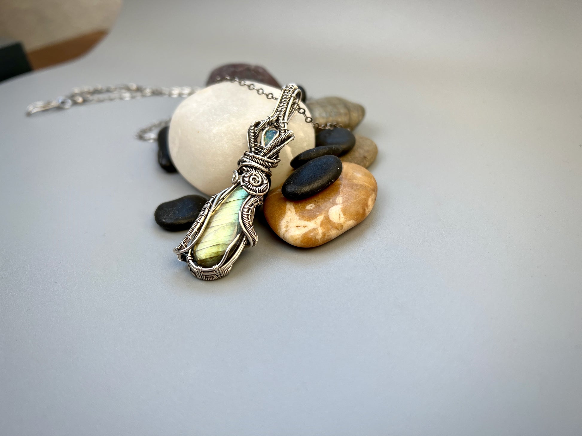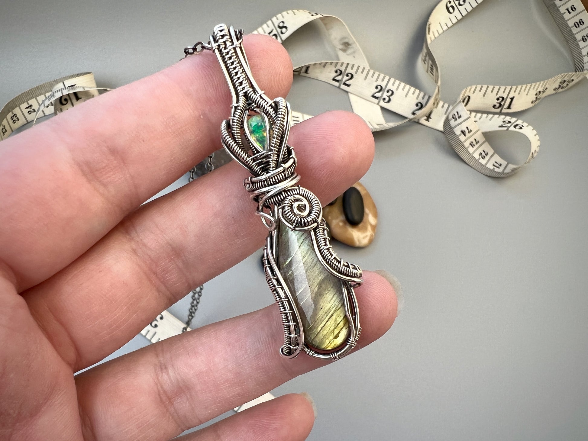 ✔ This pendant is made from .925 sterling silver wire, labradorite, and Ethiopian opal. The silver wire has been antiqued (oxidized) and polished to a shine.