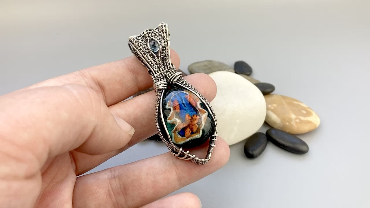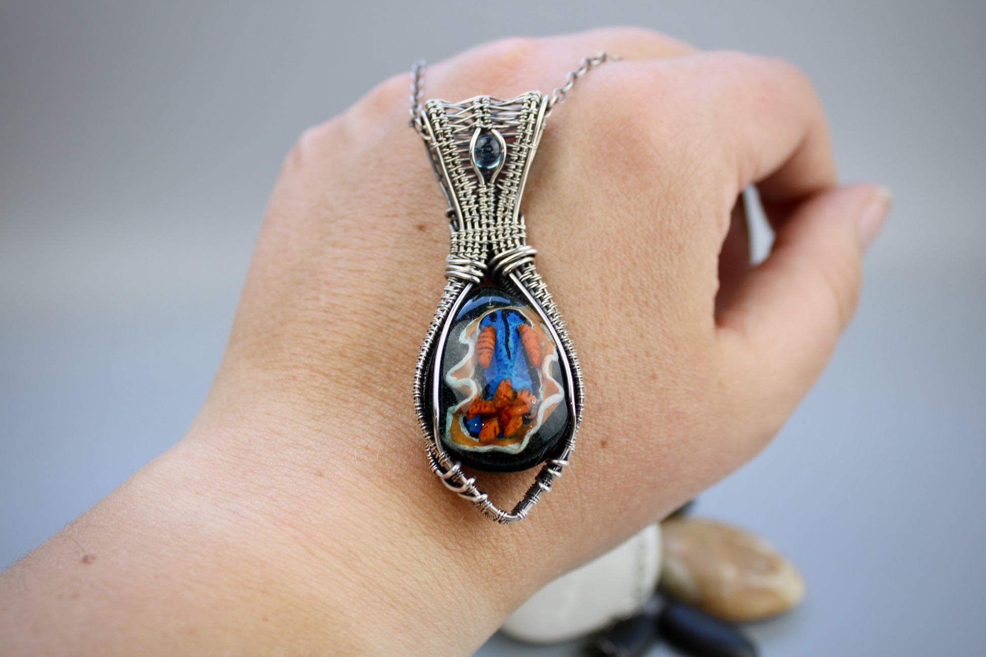✔ This pendant is absolutely unique and big. The stunning wirework fully encompasses a teardrop shaped resin stone that houses a hand-sculpted polymer clay nudibranch. A small round Sky Blue Topaz gemstone is placed into the bail as an added accent representing a water bubble. The ocean lovers will rejoice in this stunning masterpiece. Works perfectly as a gift and is certainly a statement.