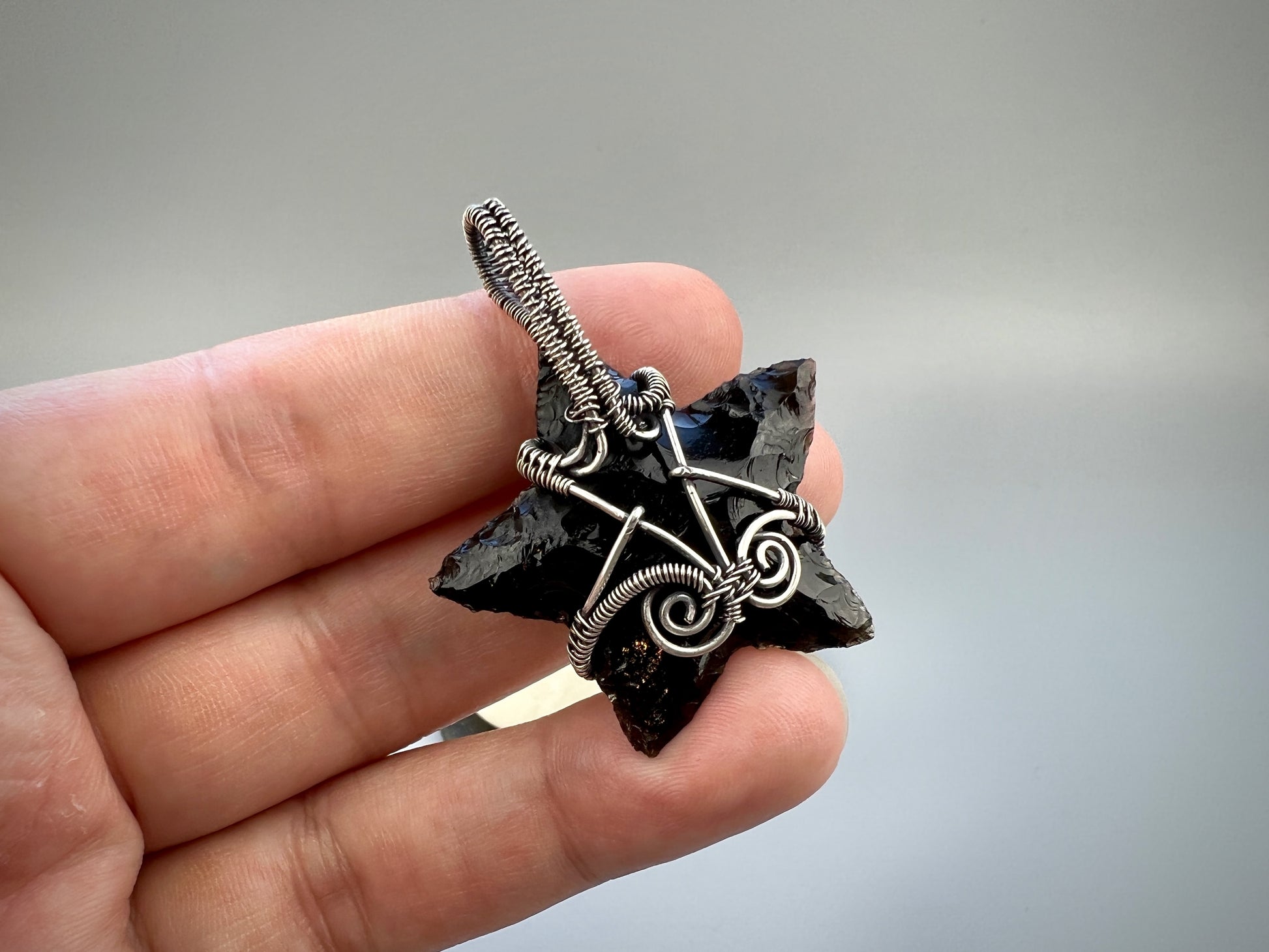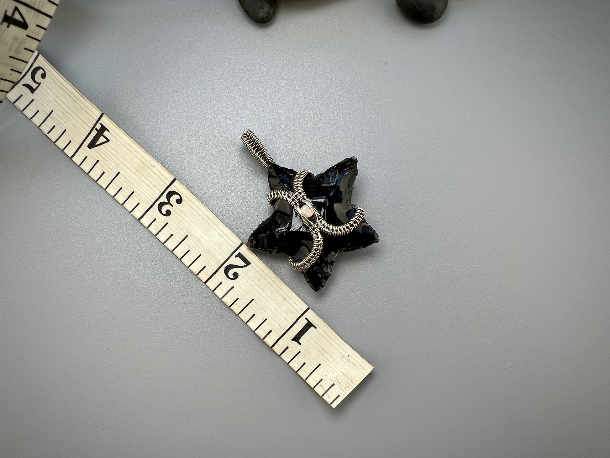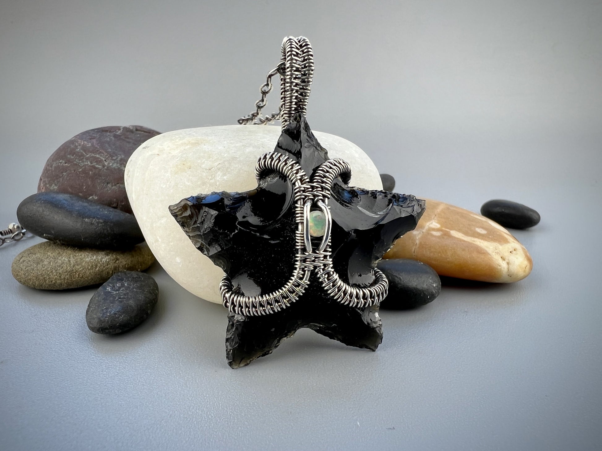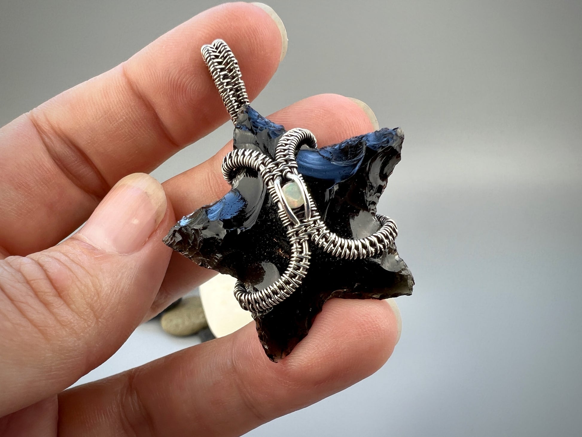 ✔ This obsidian star carving is what has been missing in your witchy wardrobe. Complete with a faceted opal, this pendant is an absolute stunner. The wire work is intricate yet leaves the stones in the foreground.