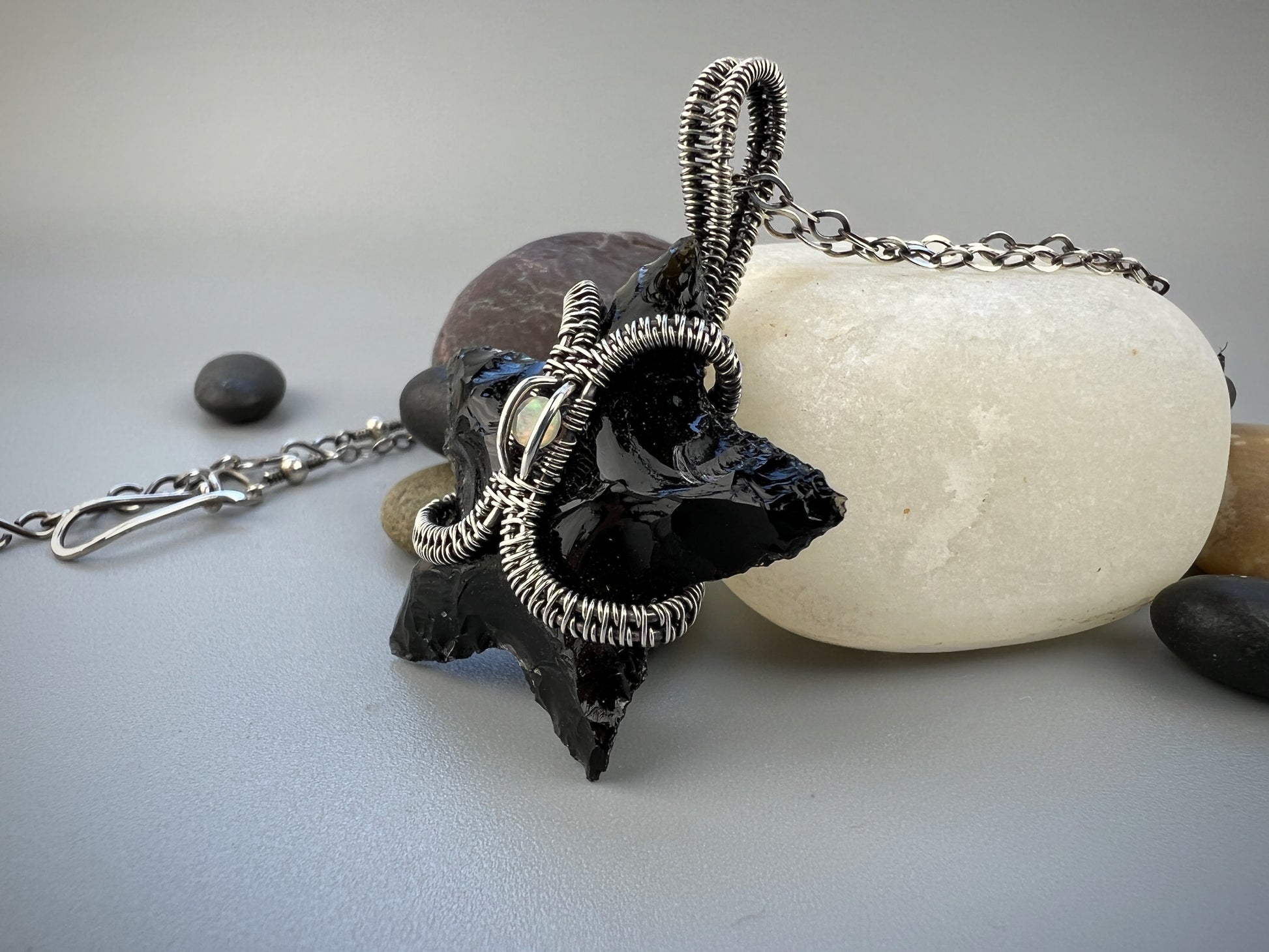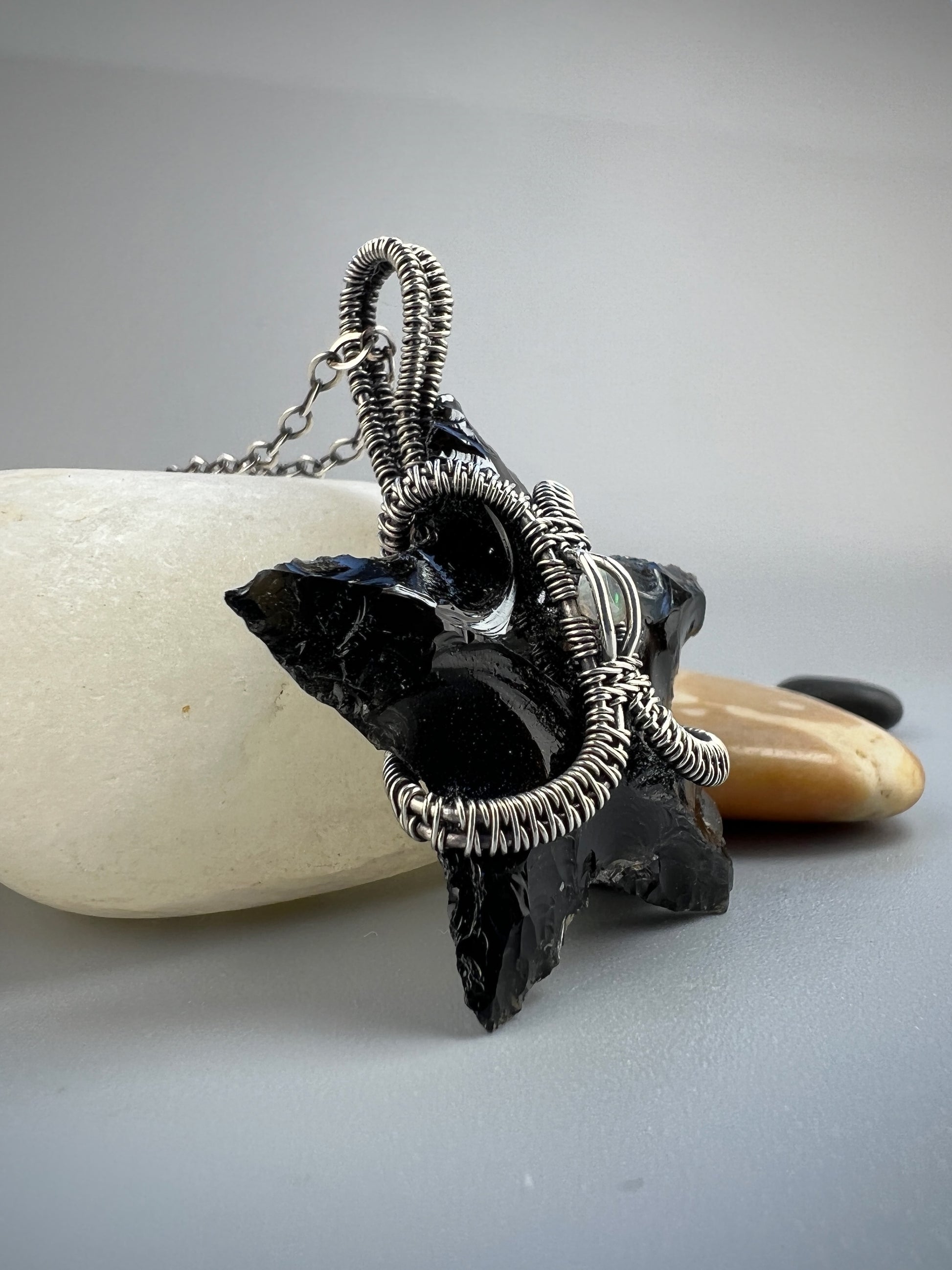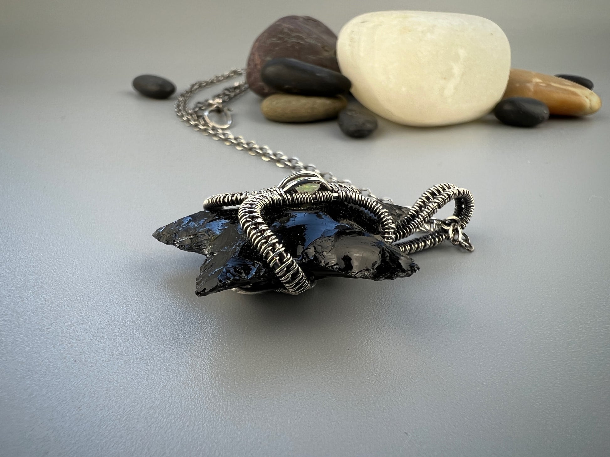✔ This pendant is made from .925 sterling silver wire, obsidian, and Ethiopian opal. The silver wire has been antiqued (oxidized) and polished to a shine.