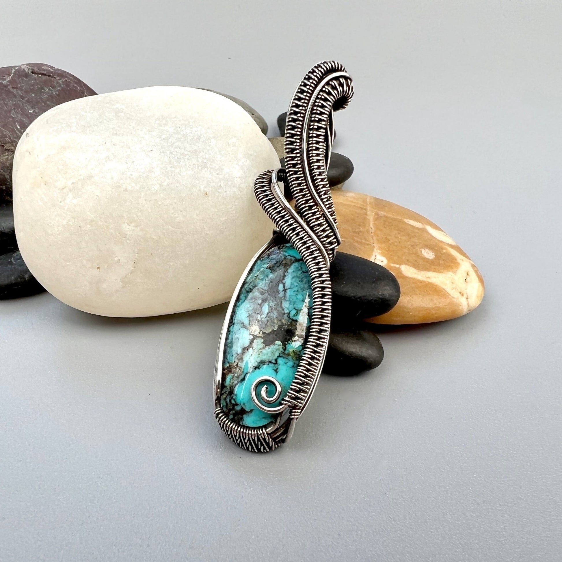✔ This pendant is made from .925 sterling silver wire, genuine Yungai turquoise (backed, not stabilized). The silver wire has been antiqued (oxidized) and polished to a shine.