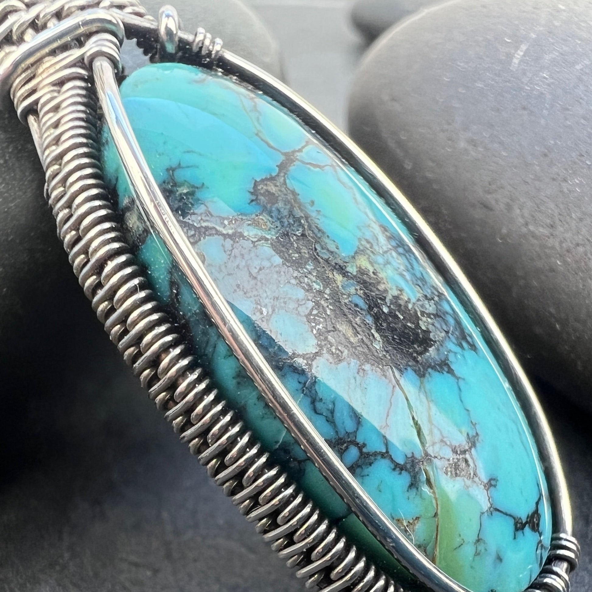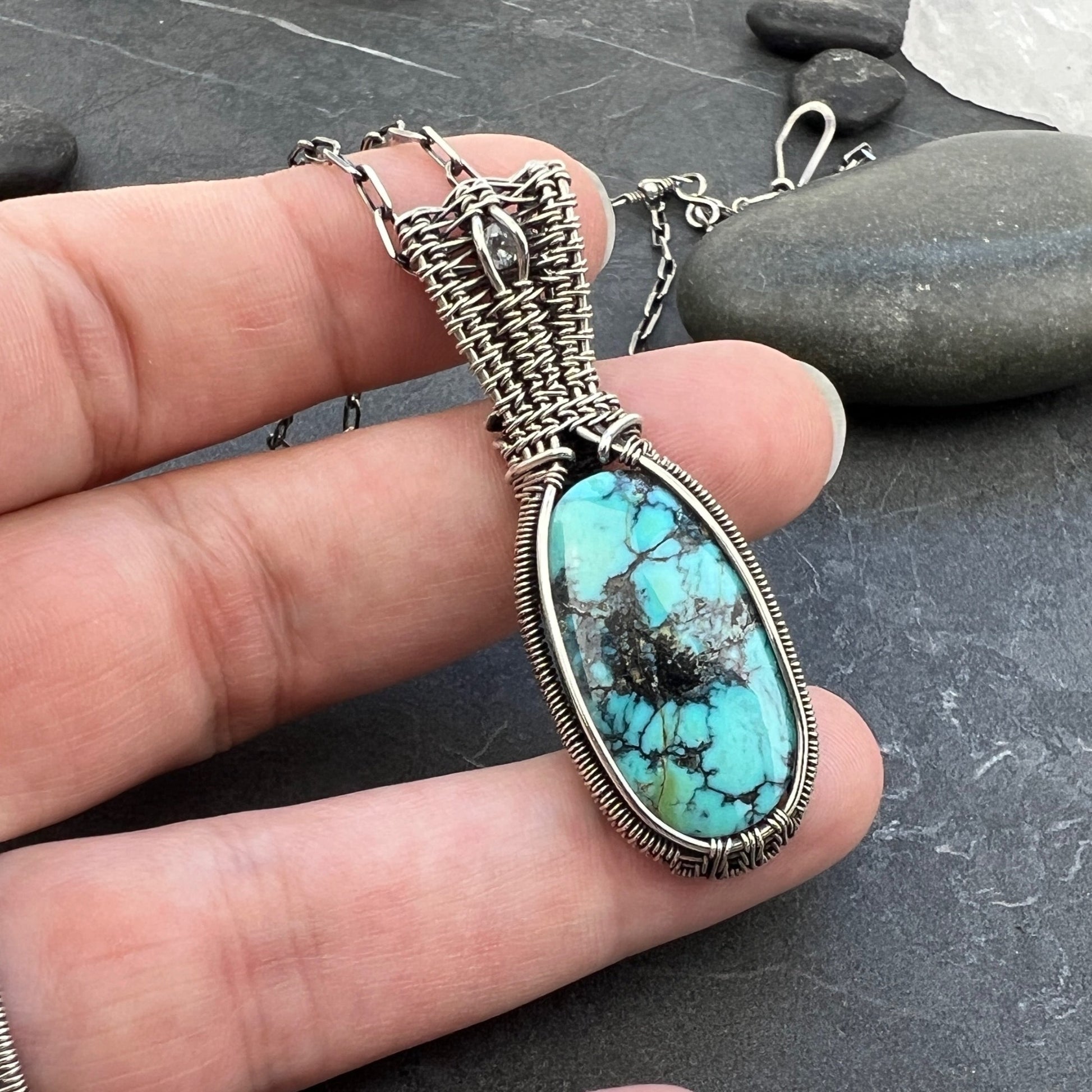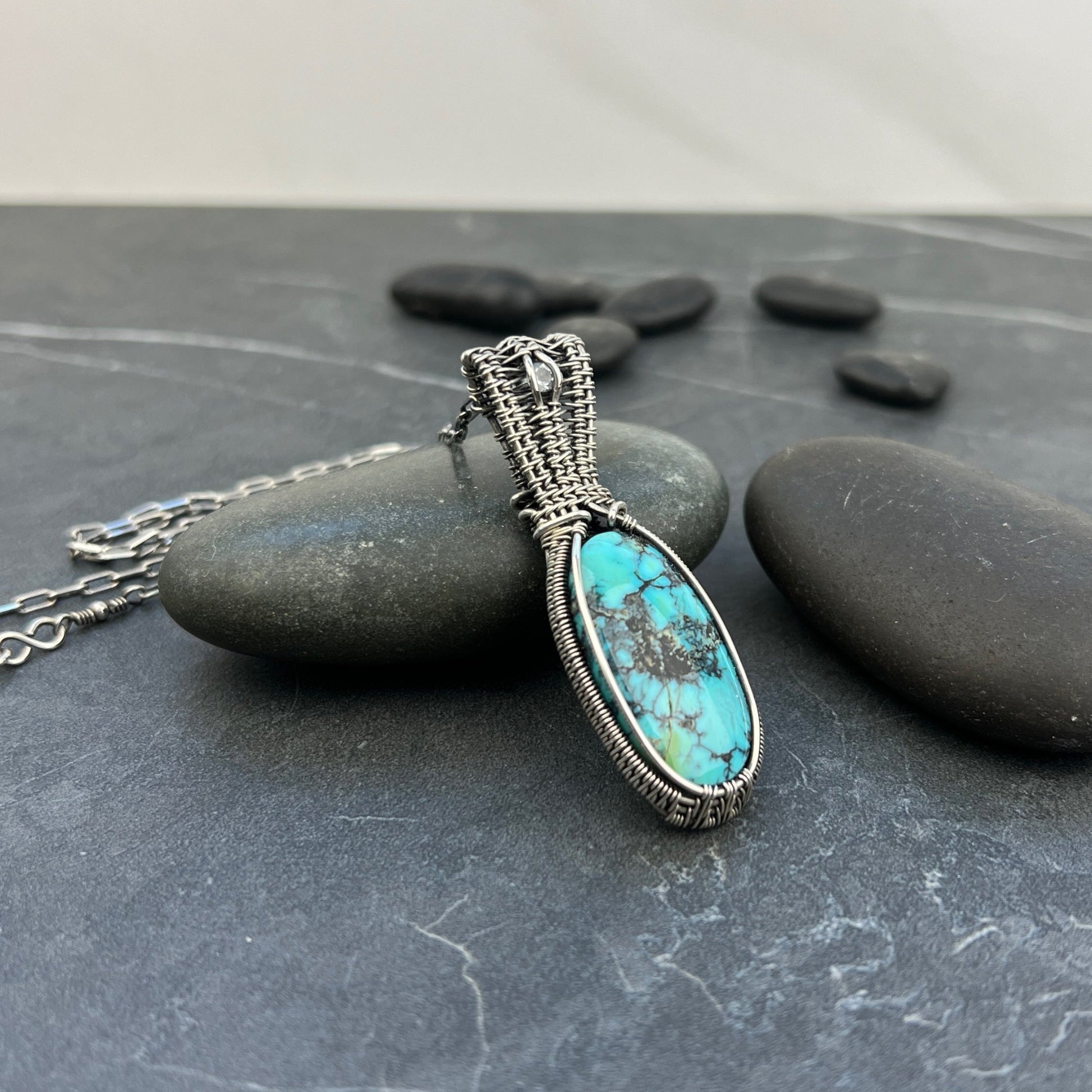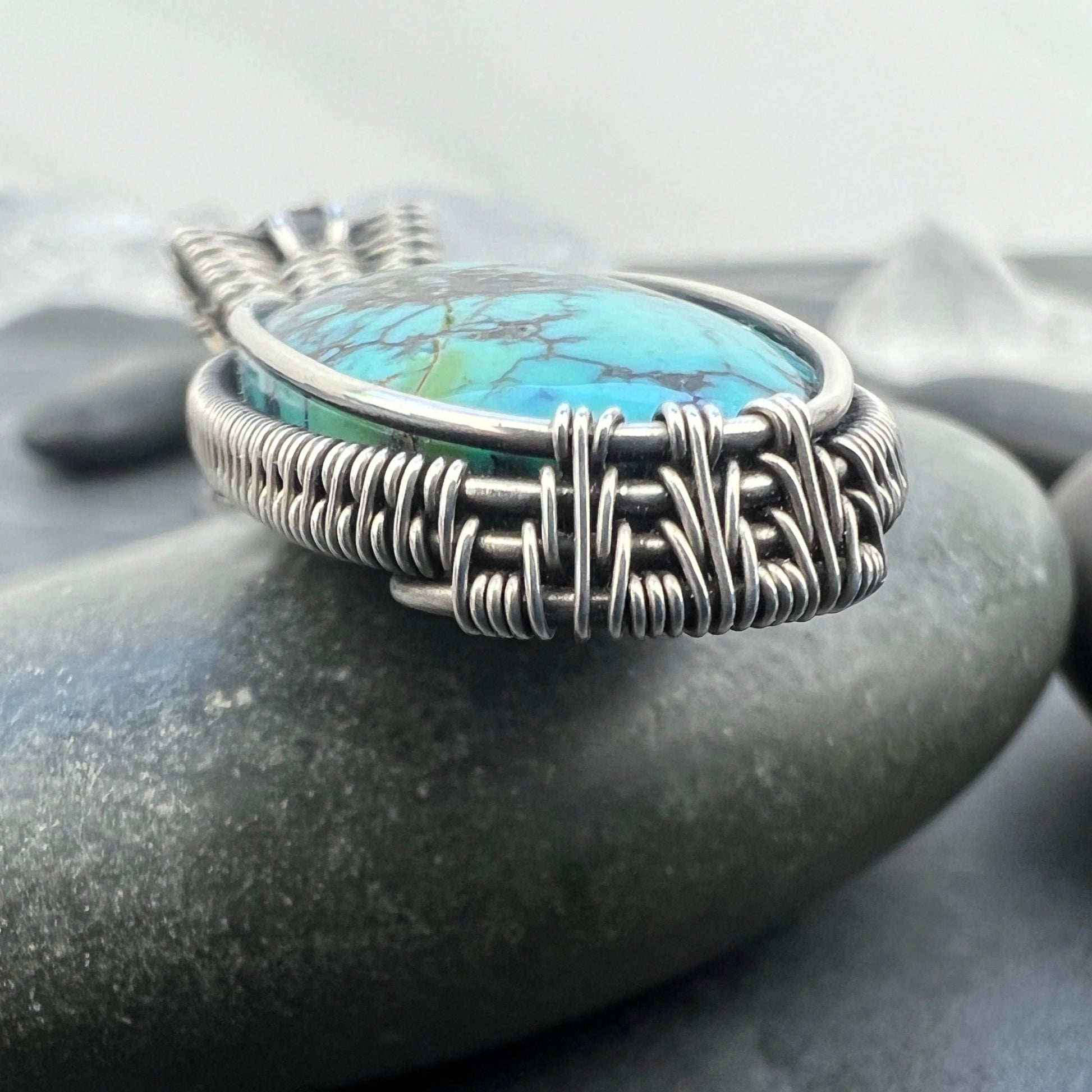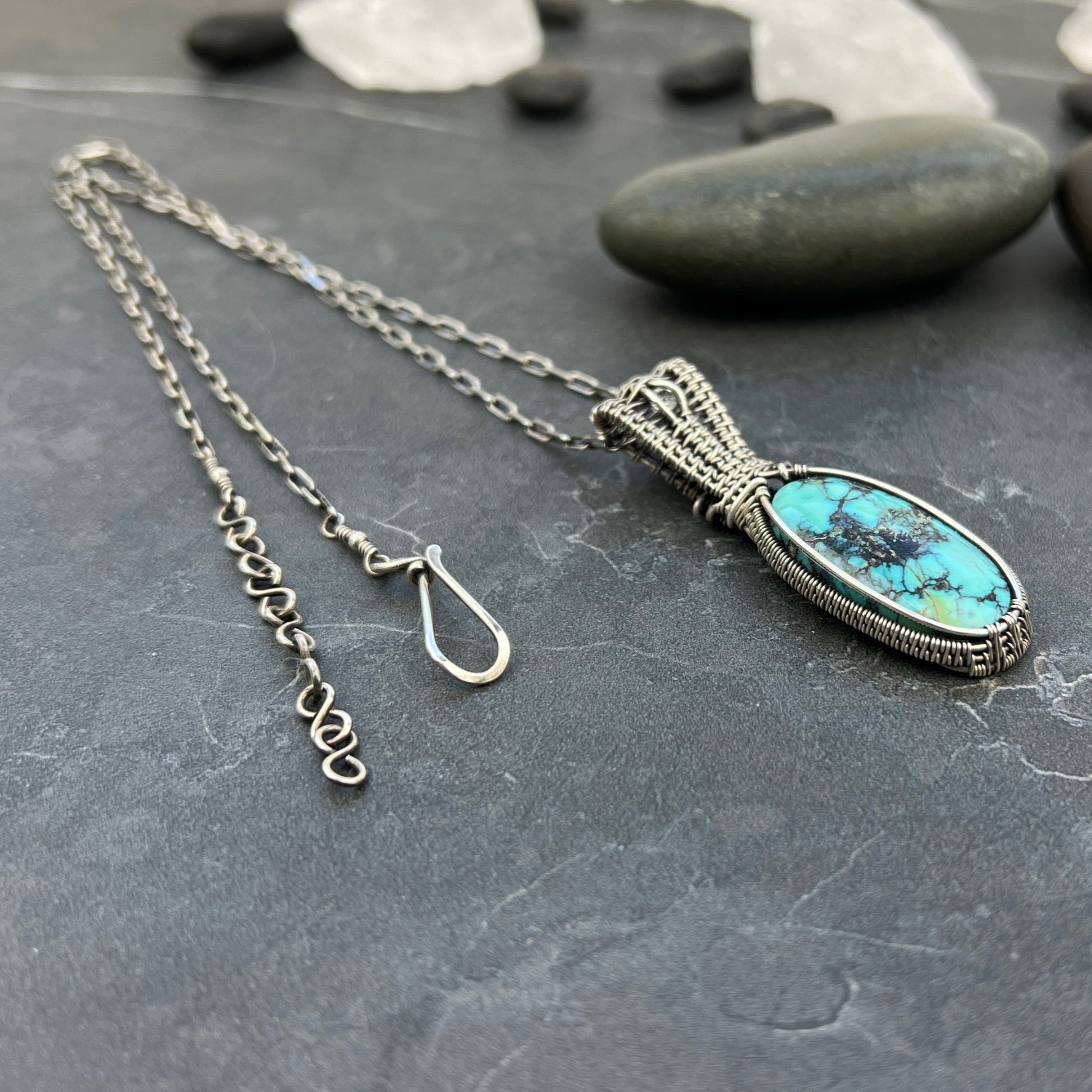 ✔ This pendant is absolutely gorgeous. The stunning wirework fully encompasses an oval shaped Yunqai turquoise and cages a small faceted aquamarine for added detail. A perfect addition to any outfit! Works perfectly as a gift and is certainly a statement.