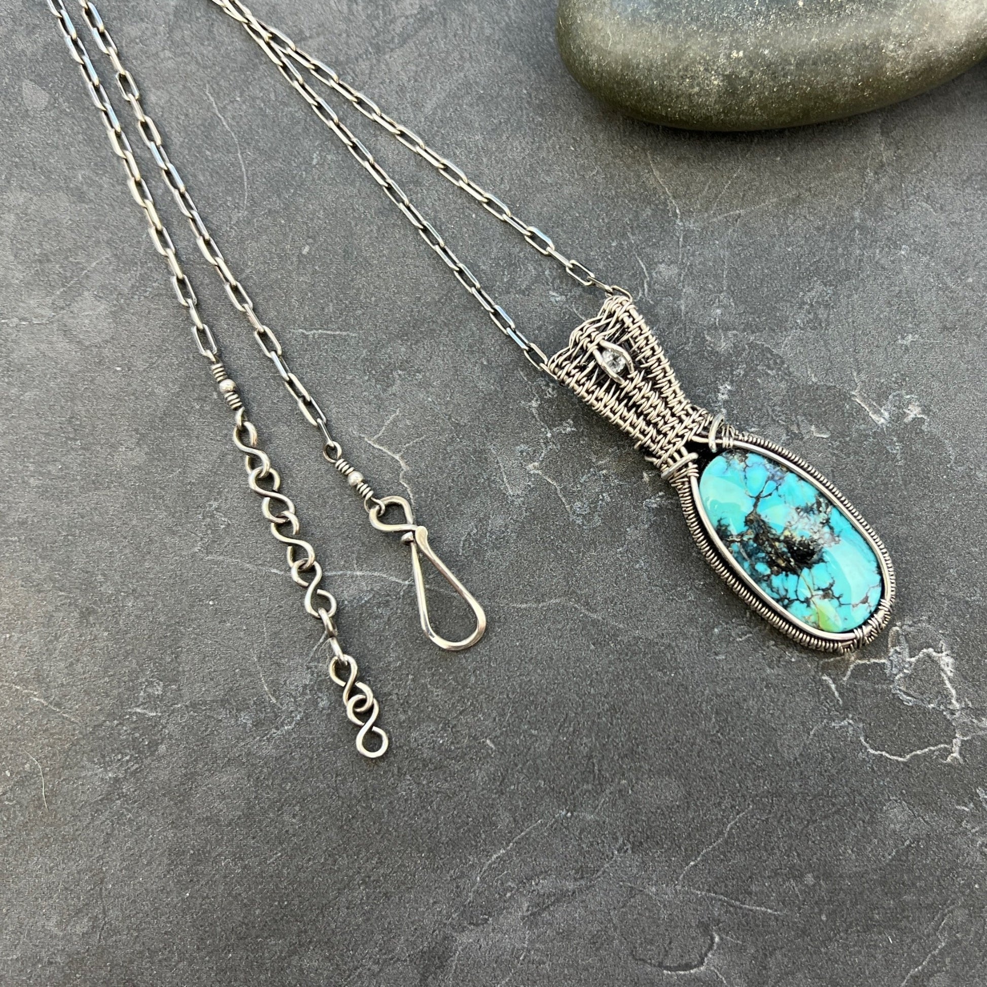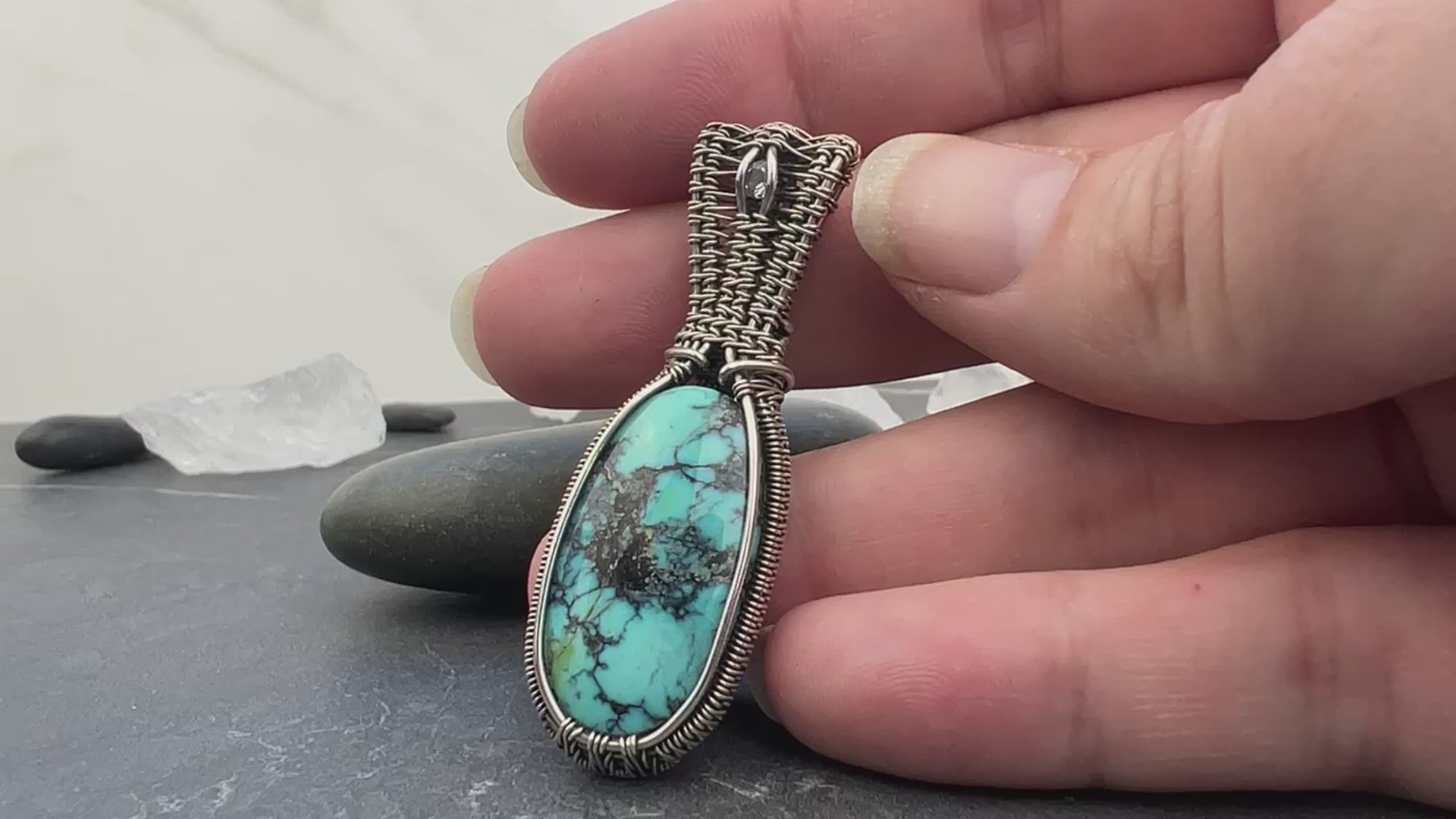 ✔ This pendant is made from .925 sterling silver wire, genuine Yunqai turquoise (backed, not stabilized), and faceted aquamarine. The silver wire has been antiqued (oxidized) and polished to a shine.
