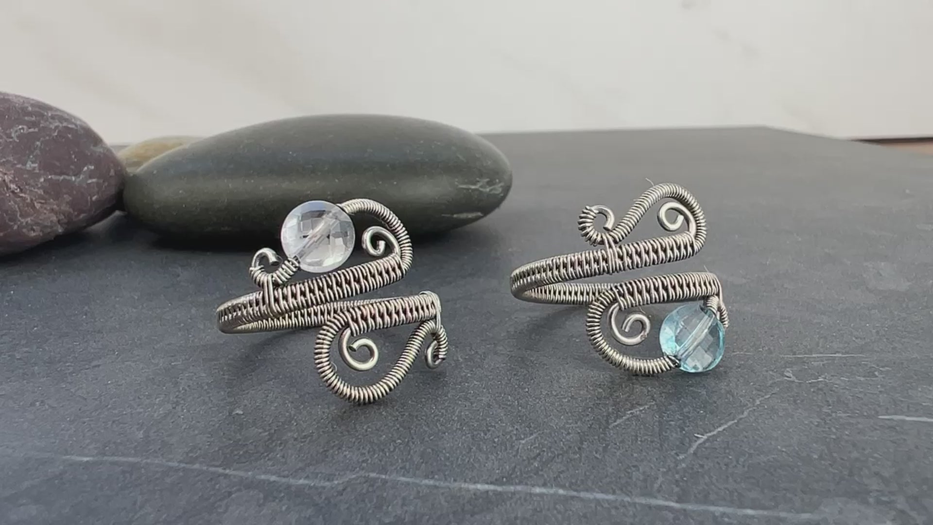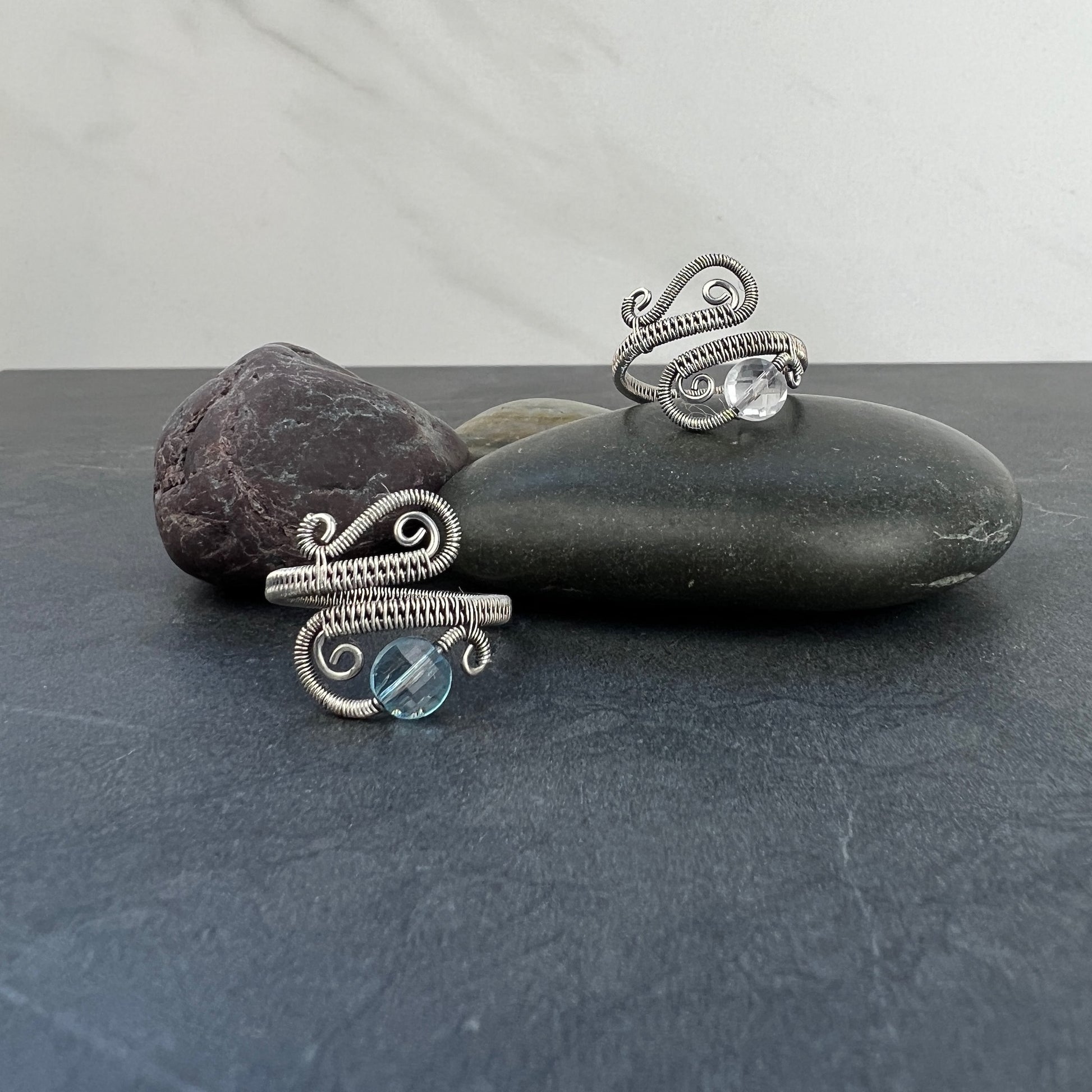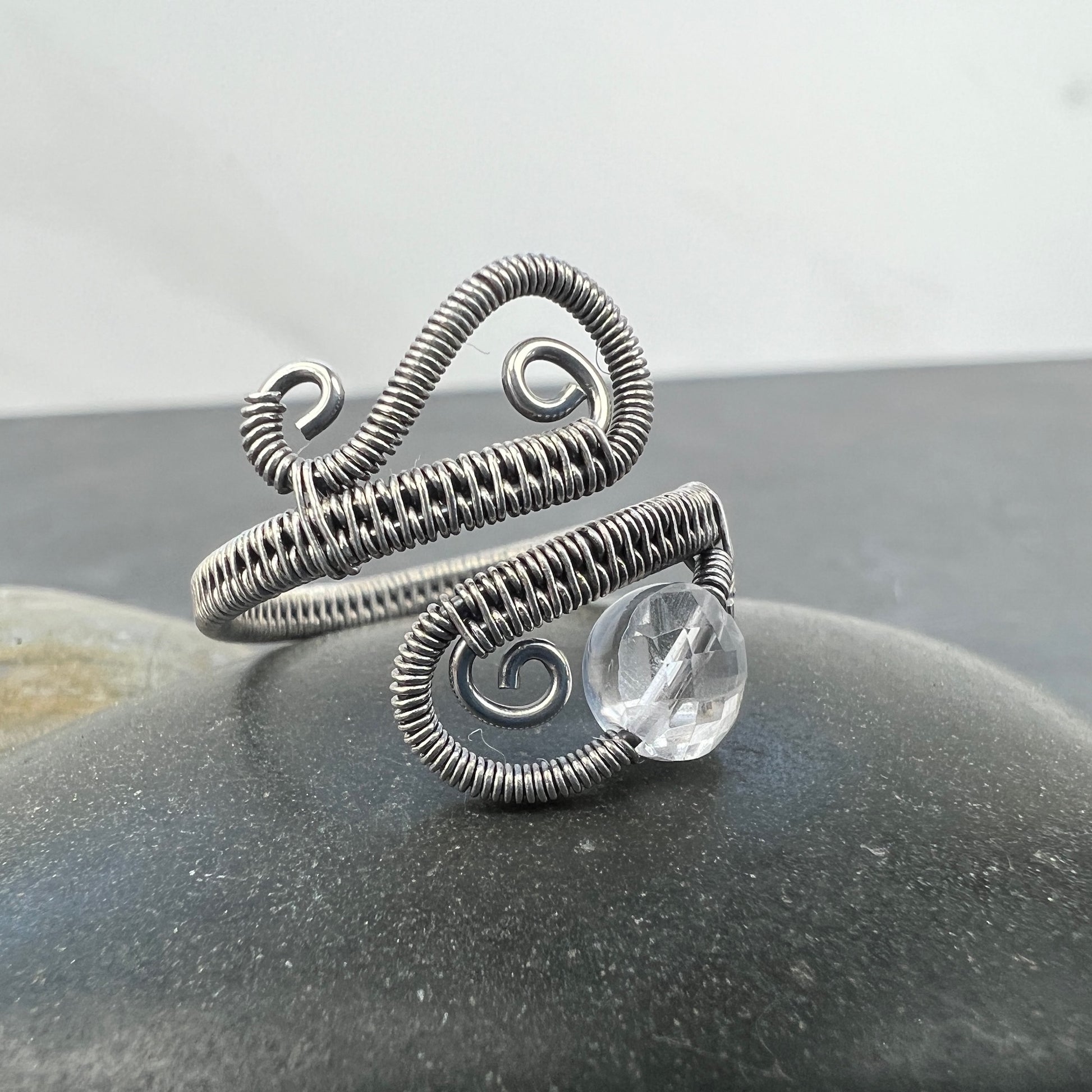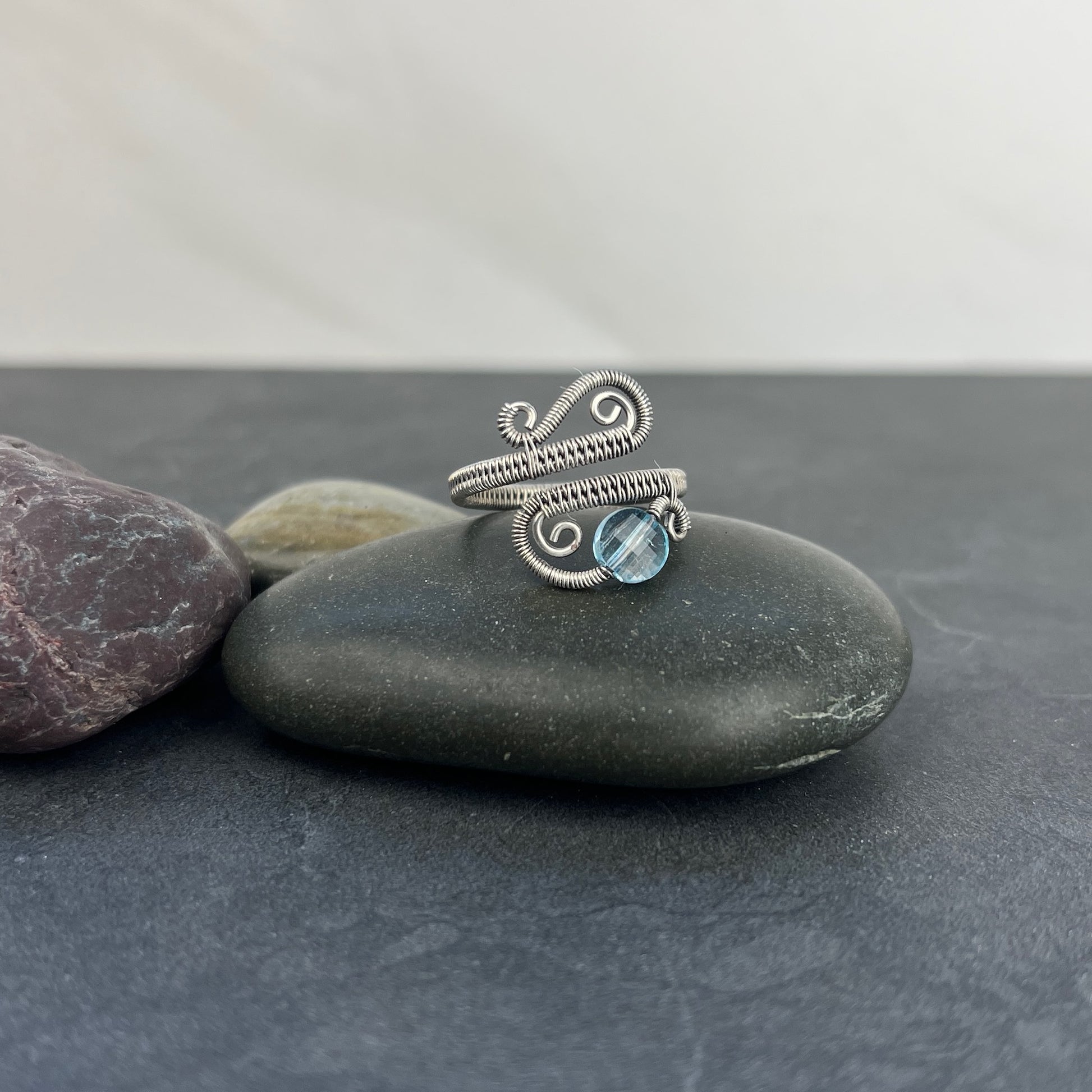 ✔ The ring is made from .925 sterling silver wire. It was antiqued (blackened/oxidized) and then polished to a shine. The two available stone options are: blue topaz and clear quartz.