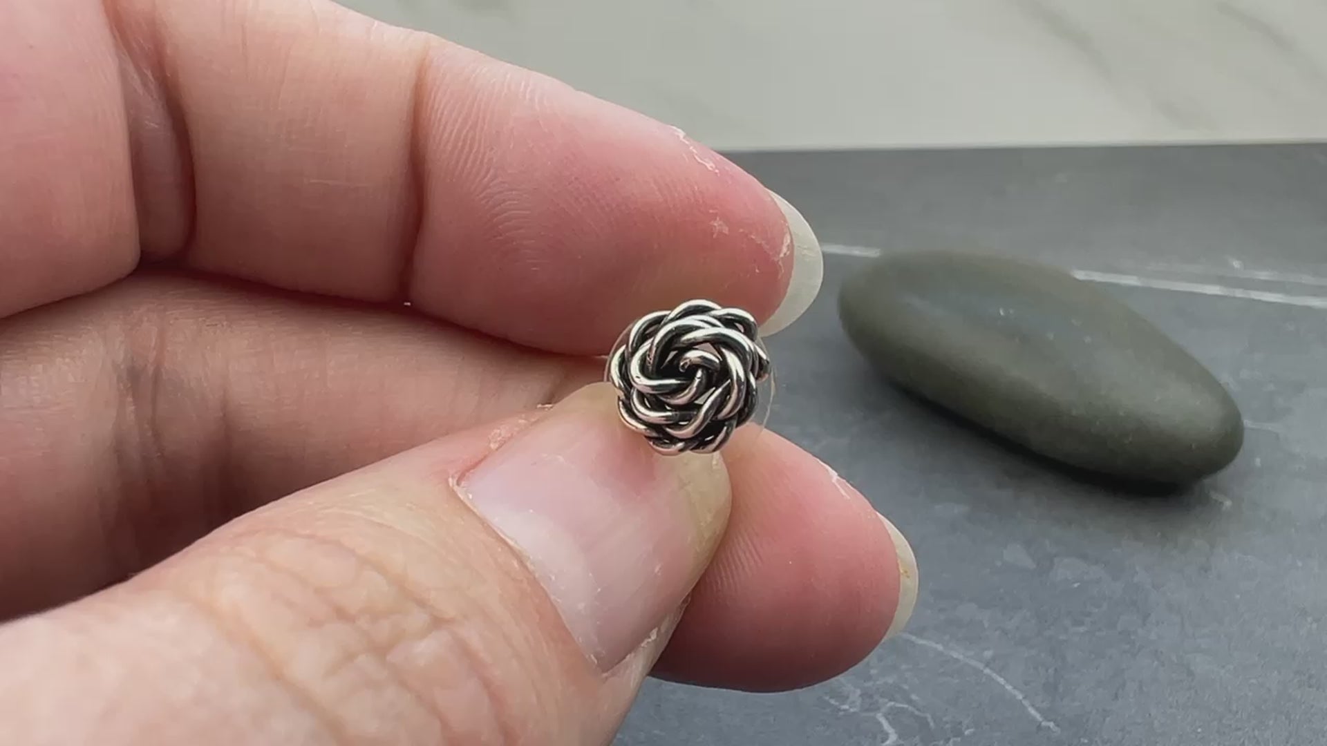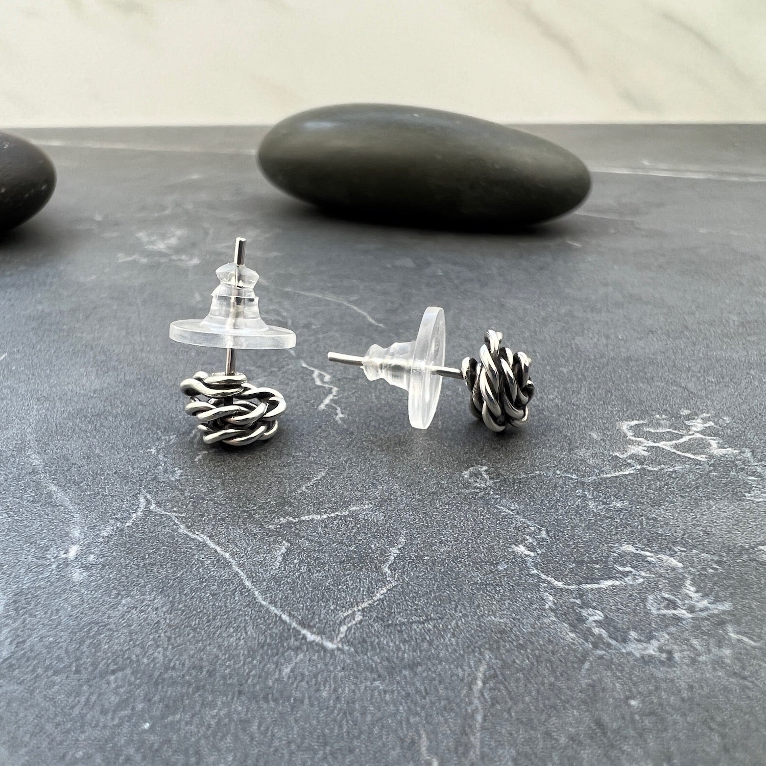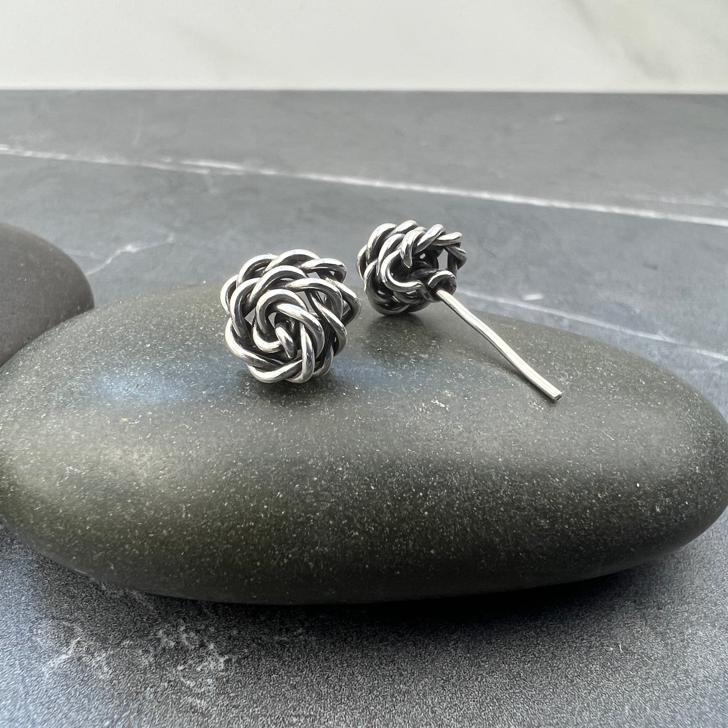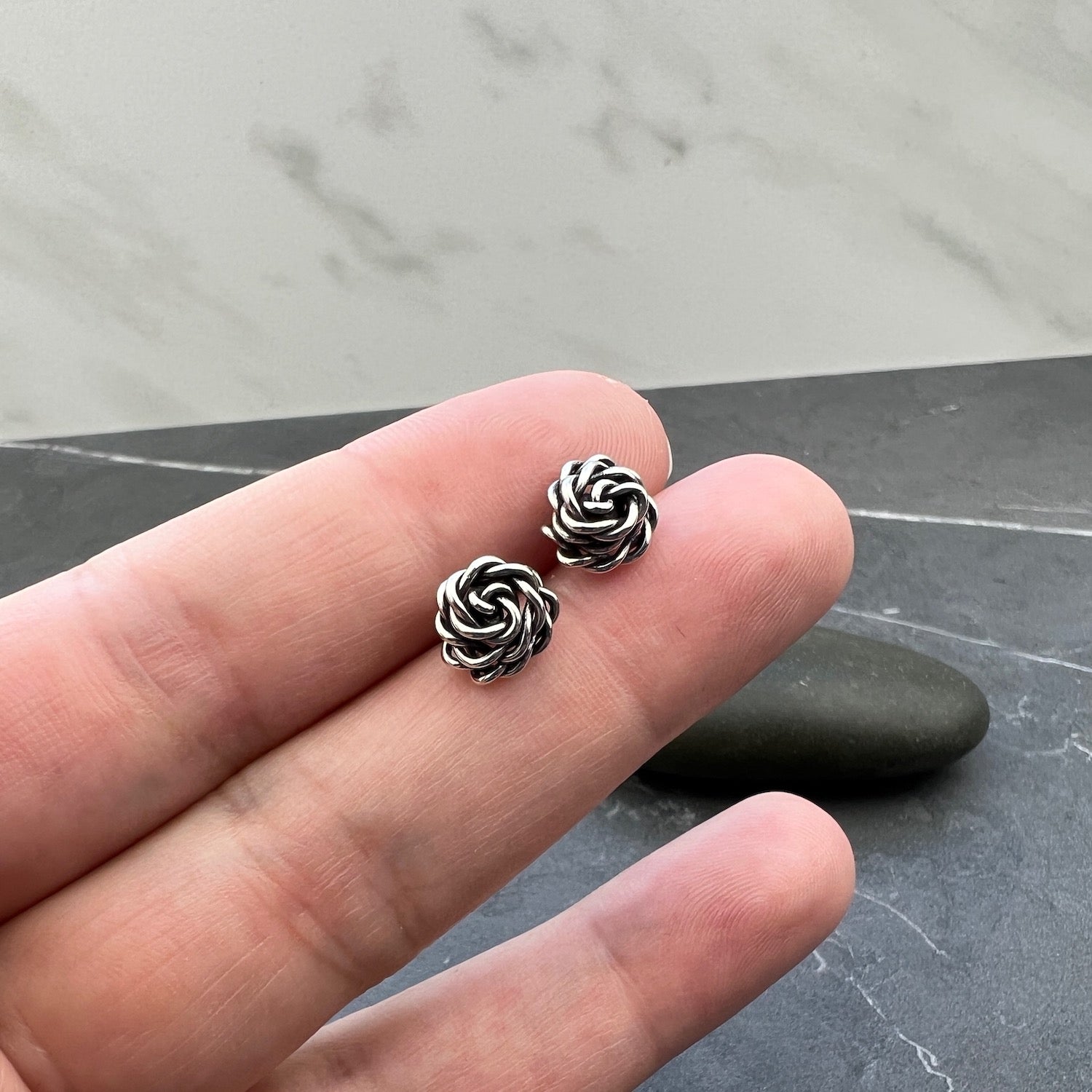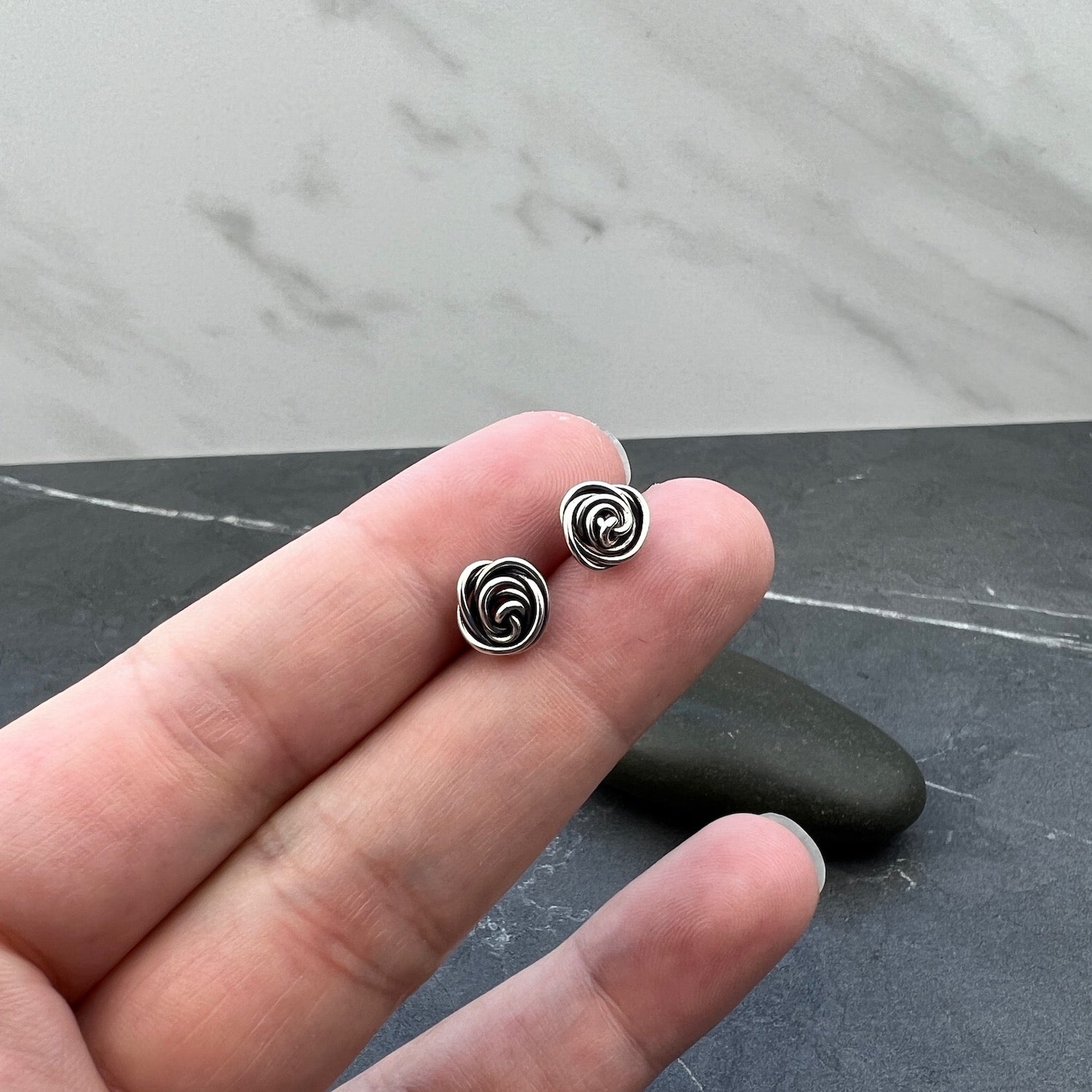 ✔ These wonderful stud earrings are made of solid 0.925 sterling silver. The diameter of the rose is approximately 1/4". The wire is oxidized (antiqued/blackened) and polished to a shine. These earrings roughly form the shape of a rose. I offer two variations: a simple rose and a twisted rose.