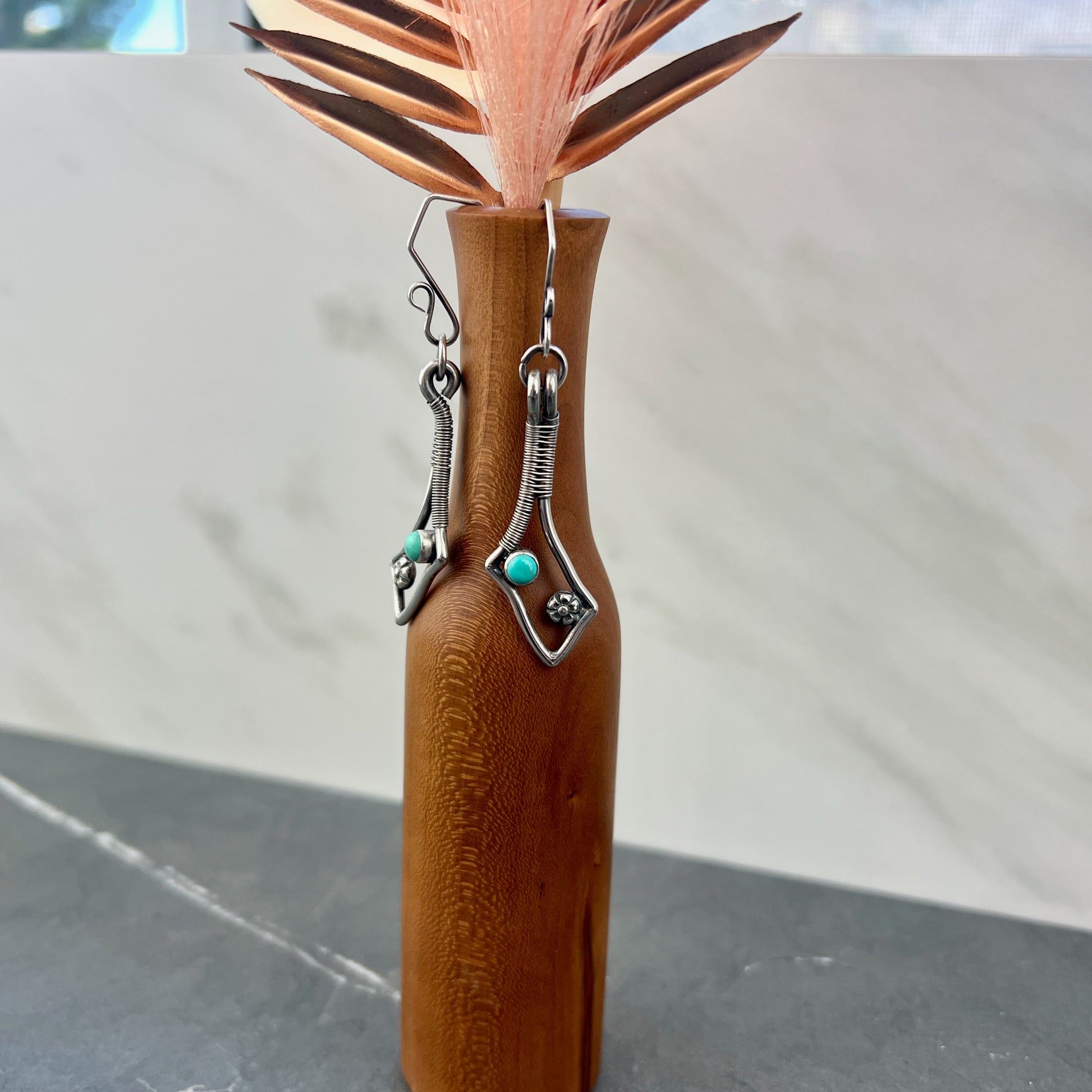 Add a touch of elegant whimsy to your summer look with our enchanting Tyrone Turquoise Bloom Earrings. These earrings boast a small, elongated shape with intricately woven wire details along its length. The tip of the earring is adorned with a delicate silver flower, adding a feminine and graceful touch. With a speck of color, the Tyrone turquoise elevates these earrings to match any summer outfit. Embrace the carefree spirit of summer with these lightweight and airy earrings that are perfect for any occasion.