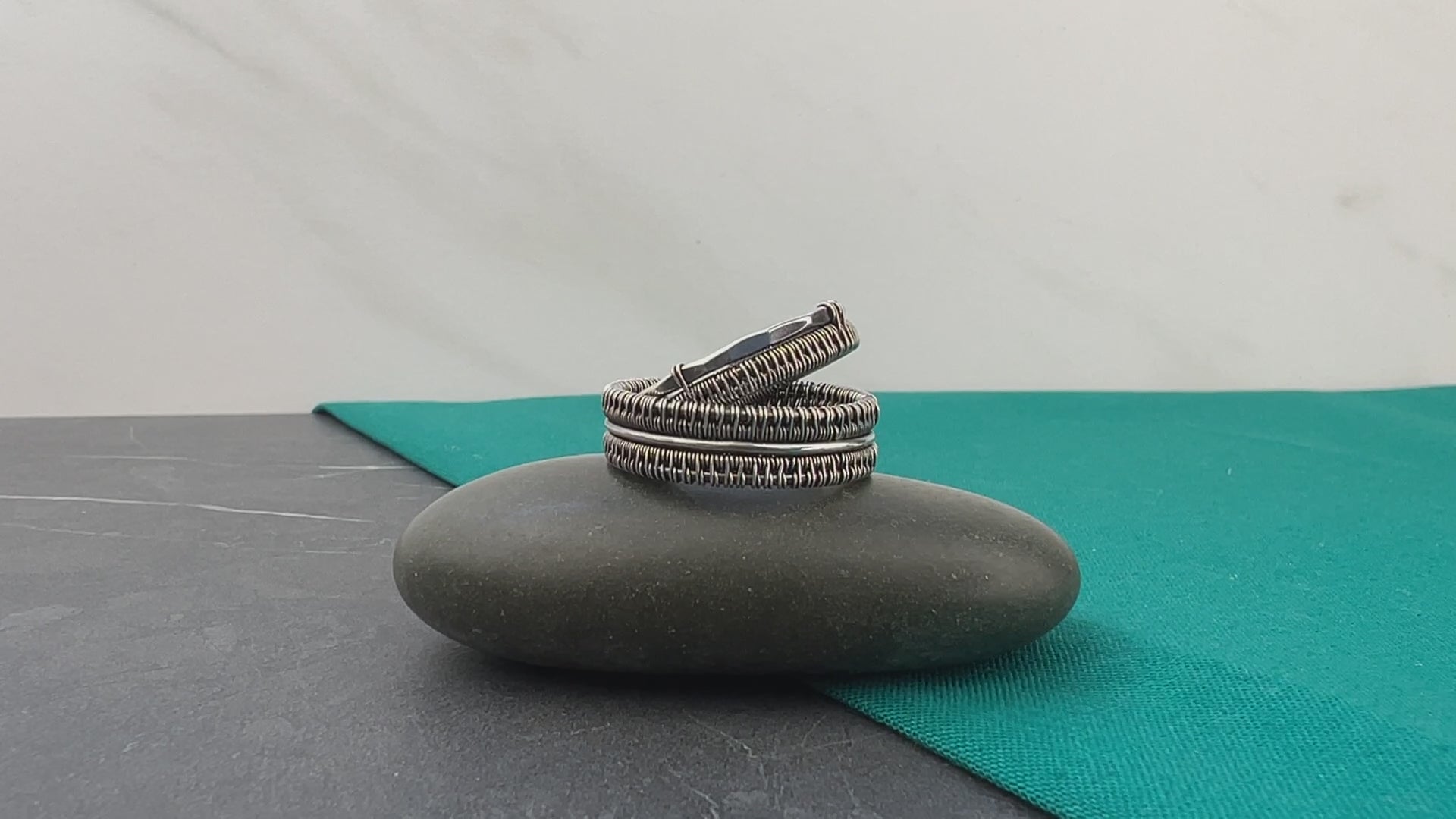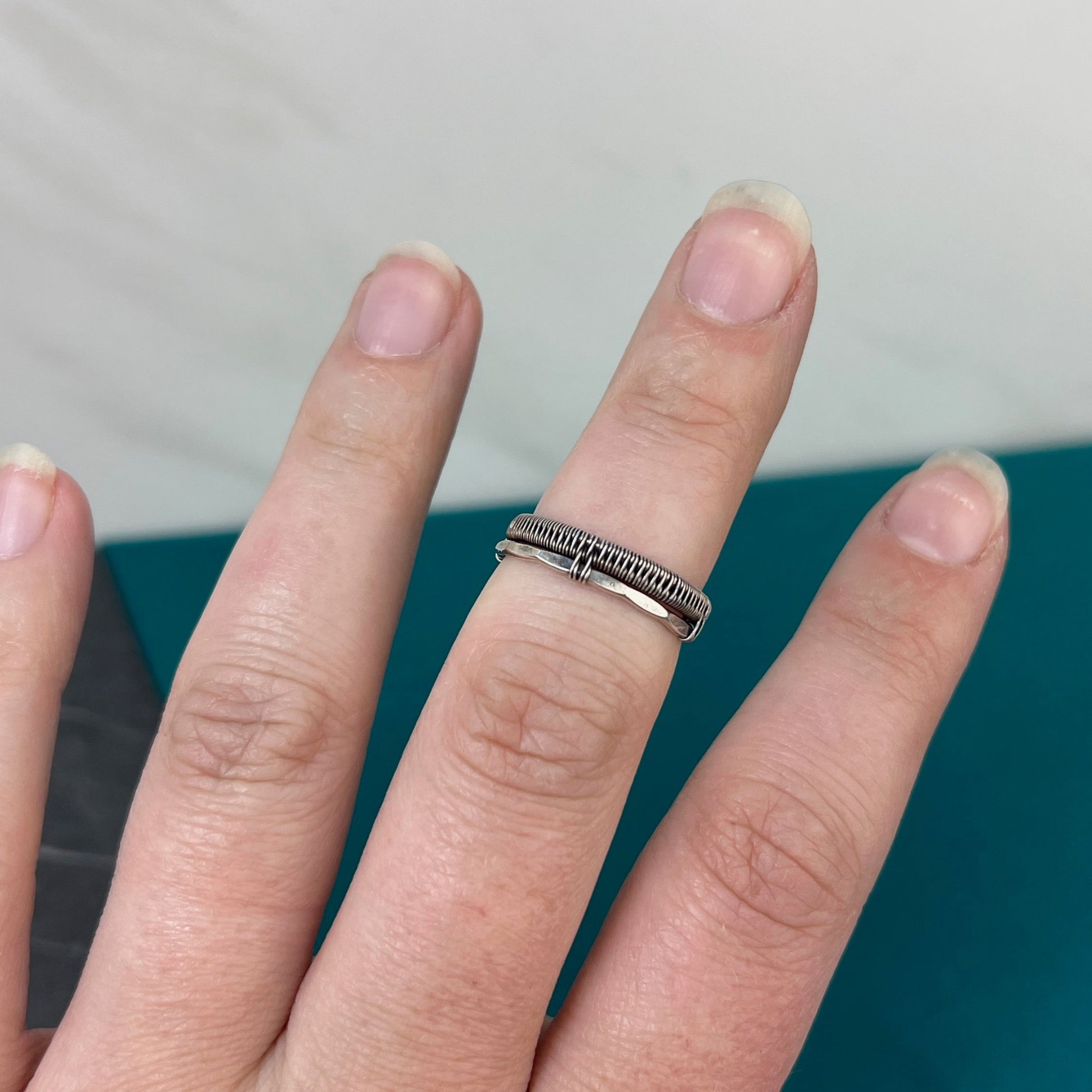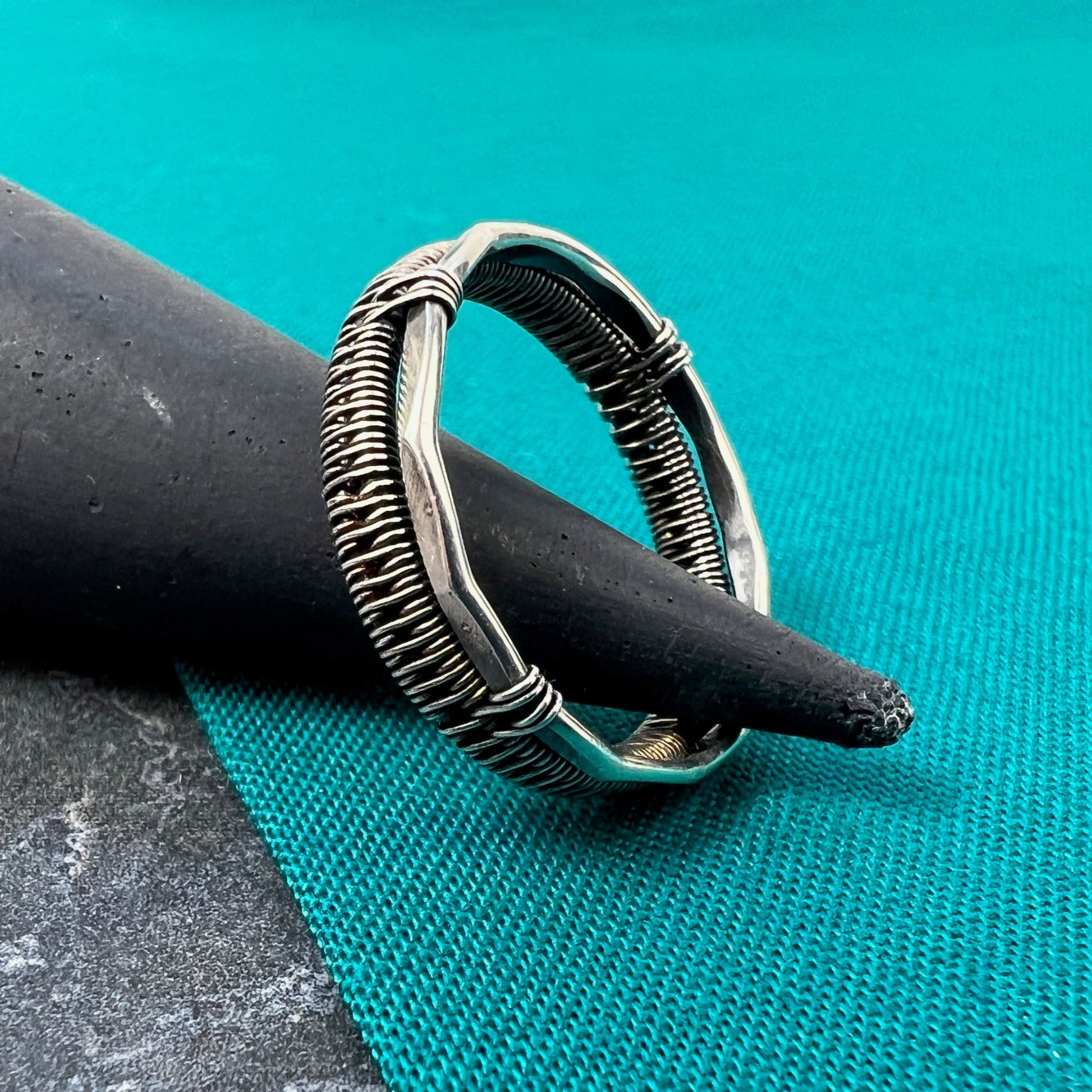 The outstanding feature of this ring is its unique design, with half of the ring intricately woven and the other half featuring a hammered band for a faceted look. The contrasting textures create a captivating visual appeal, while the play of light adds depth and intrigue. With its distinct style and attention to detail, this ring is a must-have statement piece for your collection. The ring has been oxidized and polished to a shine to create added depth in the woven texture.